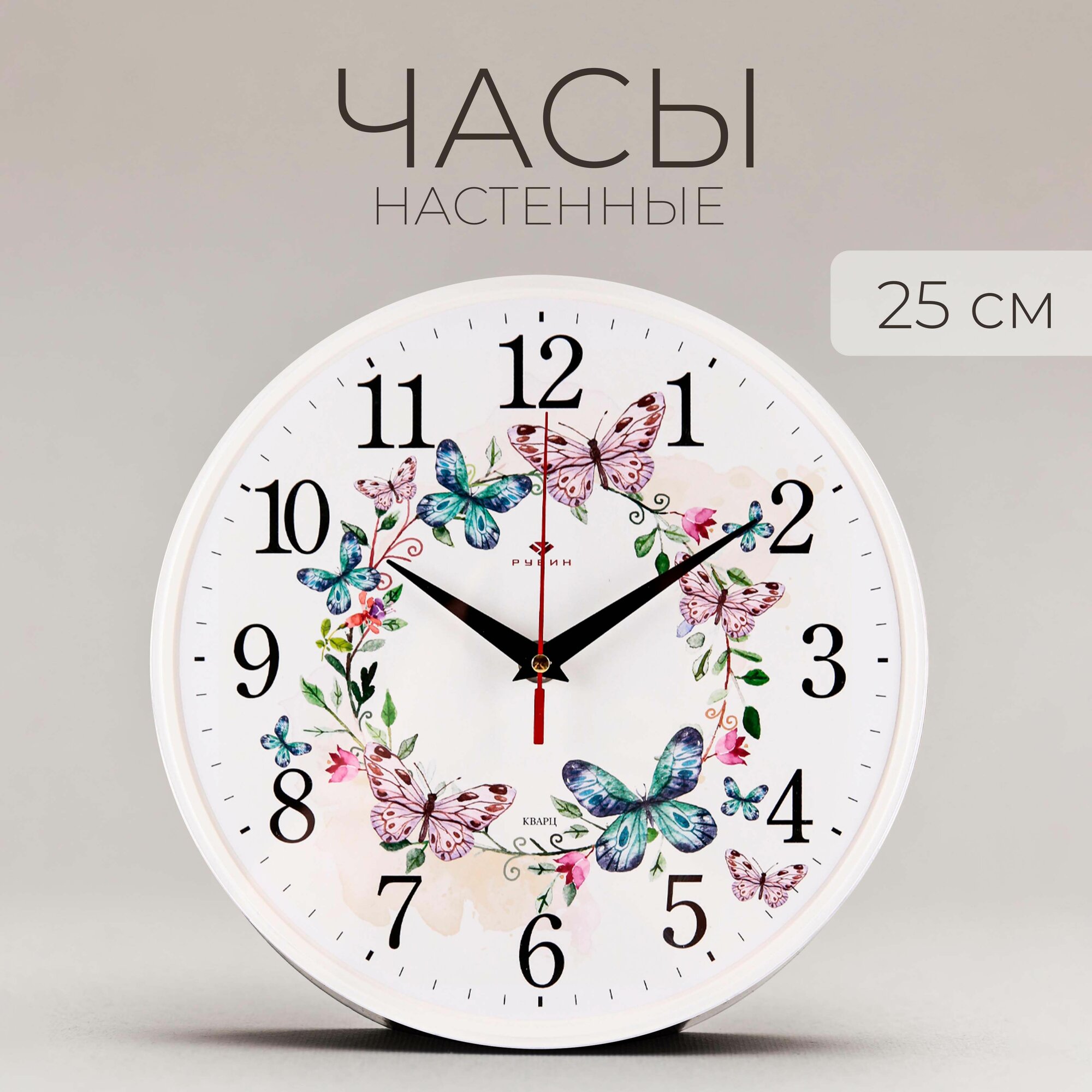 Сохранить2524-141 (10) Часы настенные круг d=25см, основание белое "Венок из бабочек" "Рубин" интересное: