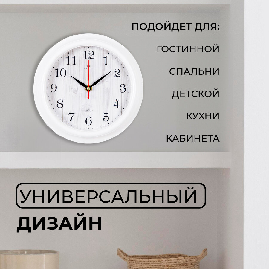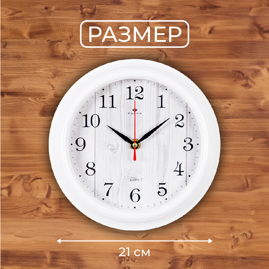 Часы настенные, кварцевые, белые, бесшумные, круглые, пластик, стекло, арабские цифры, Рубин