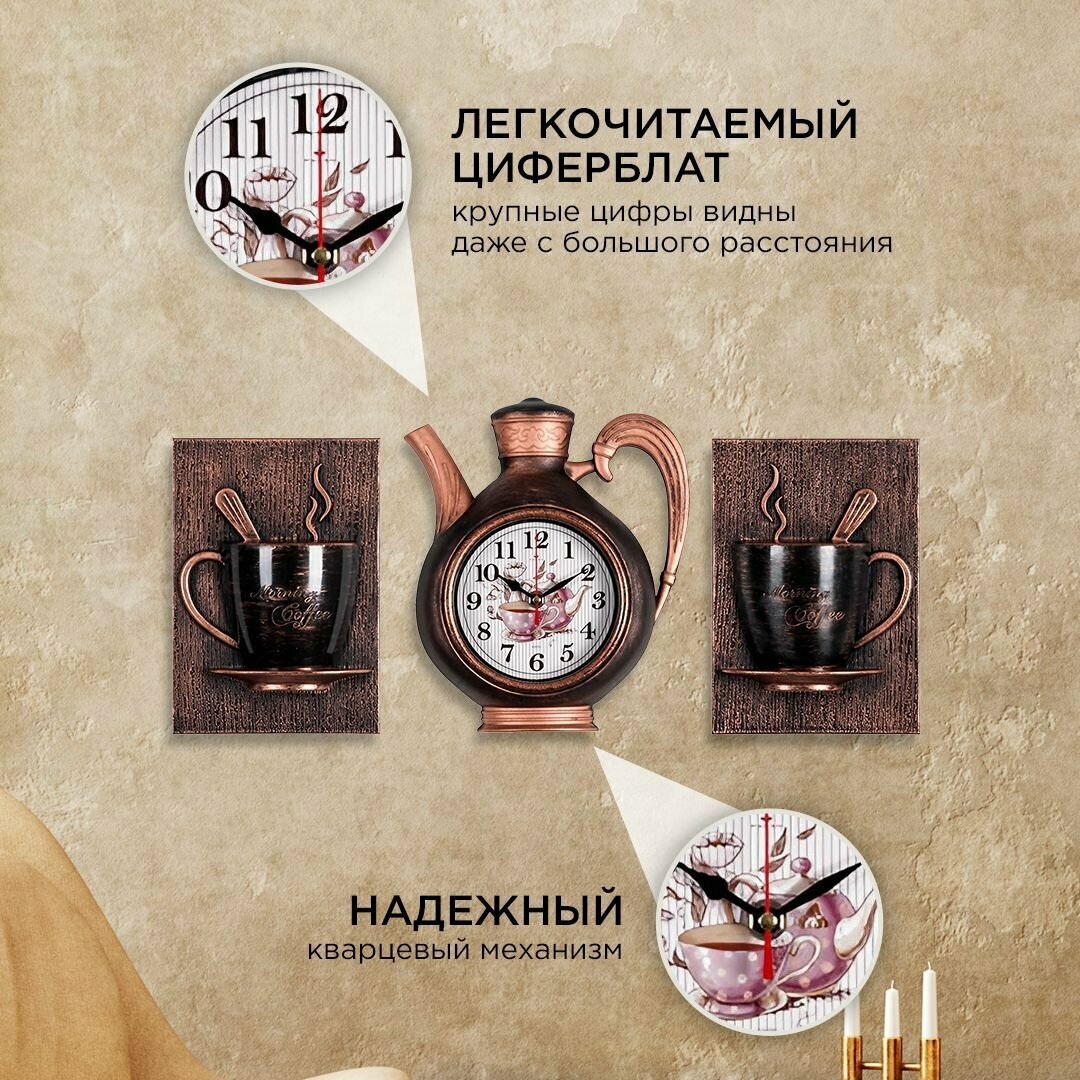 Купить Часы настенные комплект Рубин Joy чайник + 2 чашки черный с медью для кухни с плавным ходом с арабскими цифрами, ширина 53 см