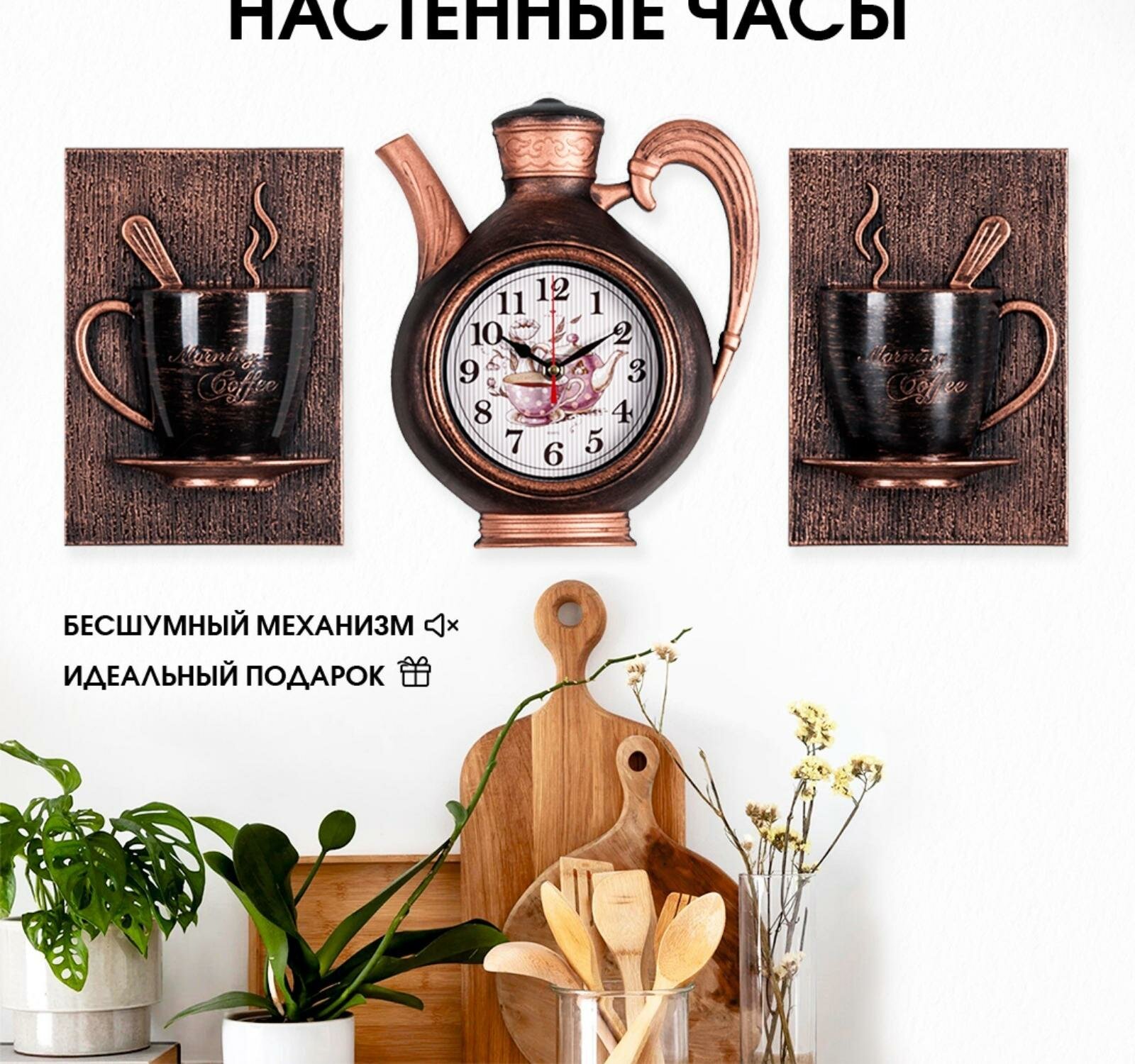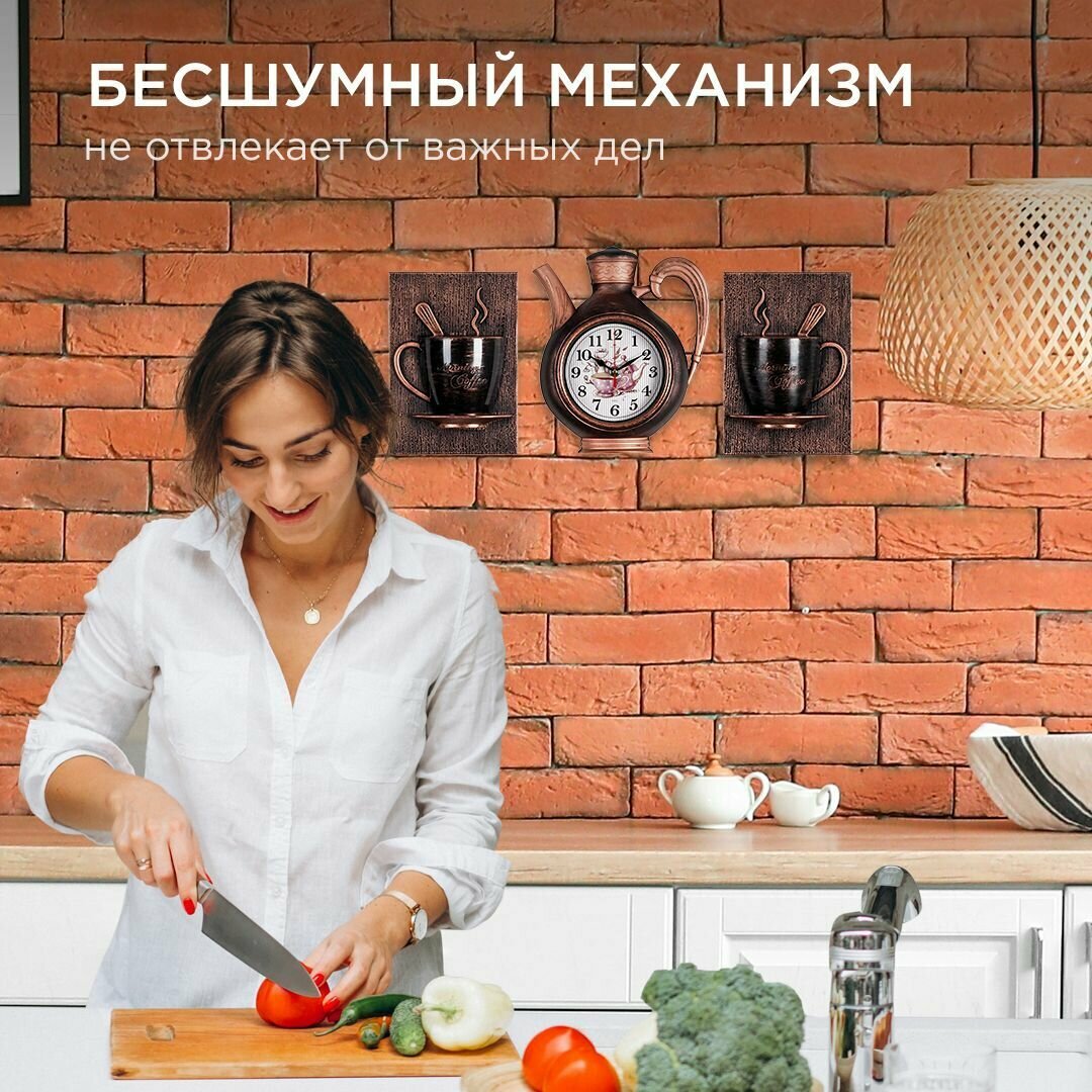 СохранитьЧасы настенные комплект Рубин Joy чайник + 2 чашки черный с медью для кухни с плавным ходом с арабскими цифрами, ширина 53 см интересное: