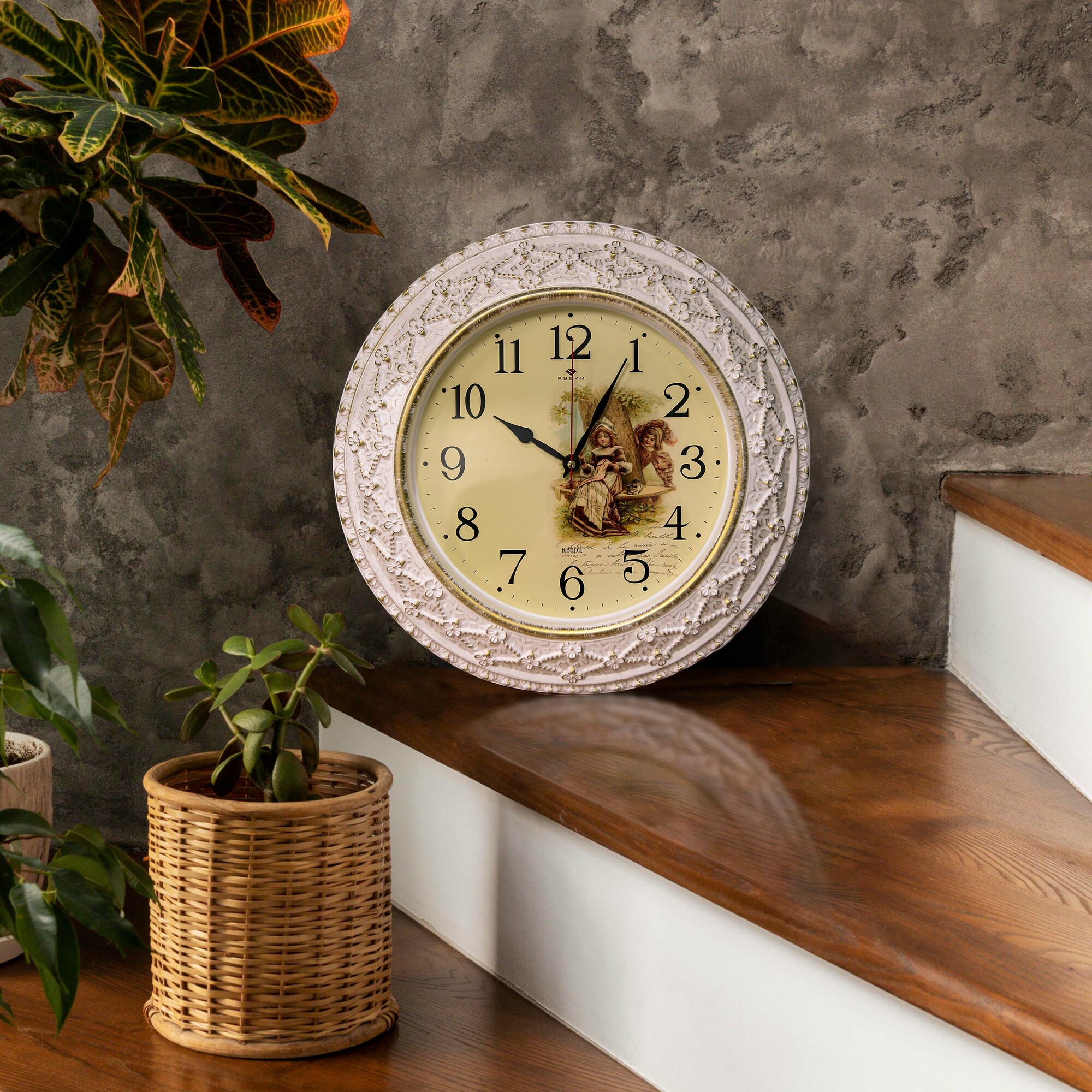 Часы белые с золотом ажурные Рубин размеры 26 см/31 см, для кухни, гостинной, спальни, бесшумные с плавным ходом