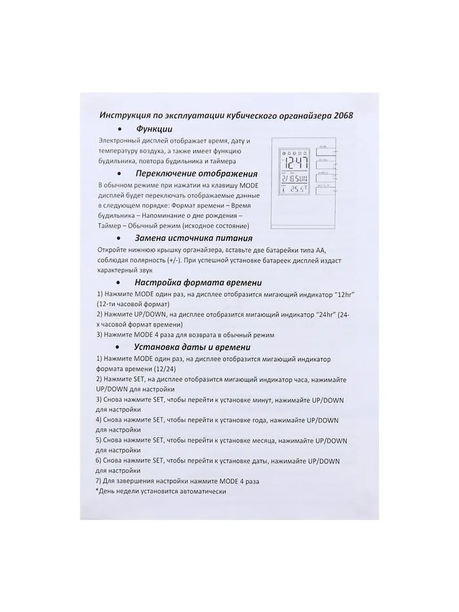 | Дополнительная информация | будильник, термометр, календарь, гигрометр |