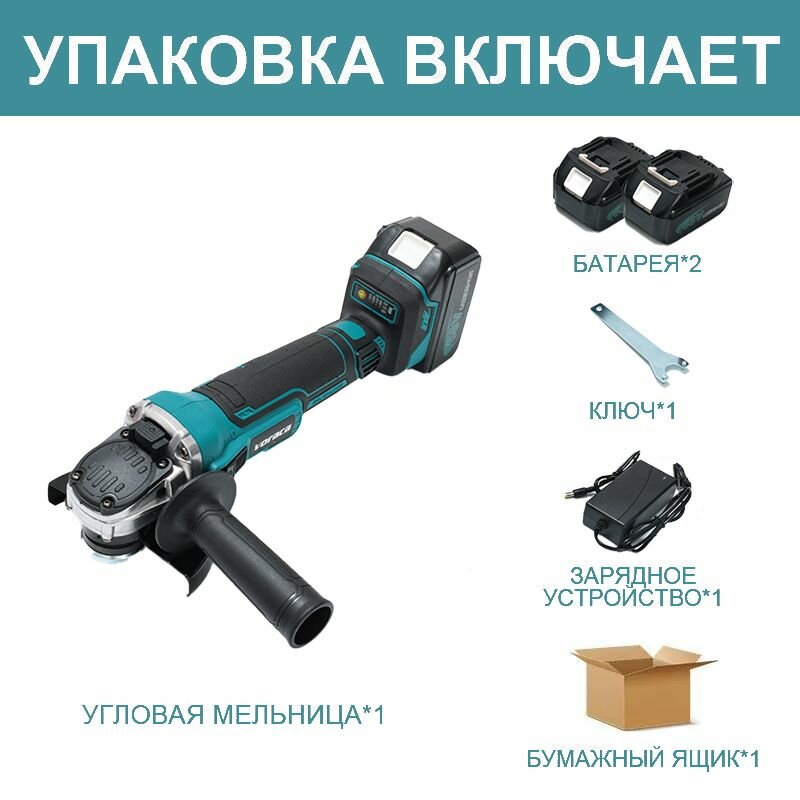 Болгарка аккумуляторная/Угловая шлифовальная машина,Бесщеточный двигатель,125 мм,800 Вт, 2 АКБ и 1 ЗУ