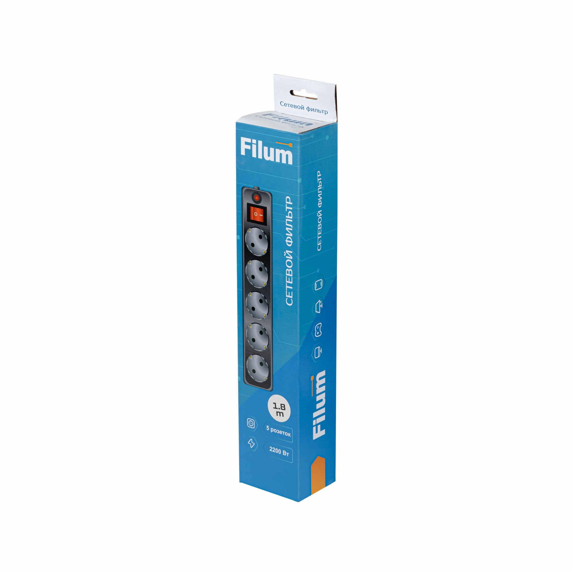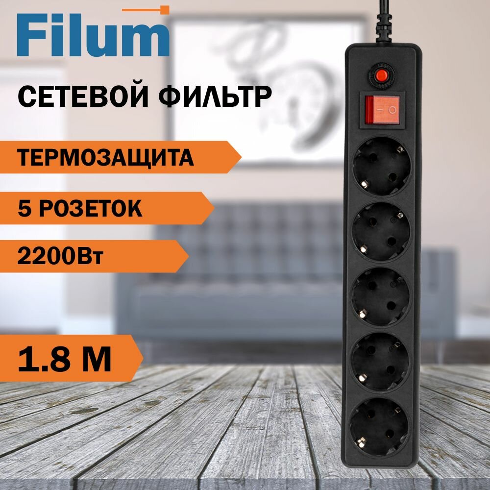 Сетевой фильтр Filum FL-SP3-5-1.8M-BL - 5 розеток, черный, 1.8 метра