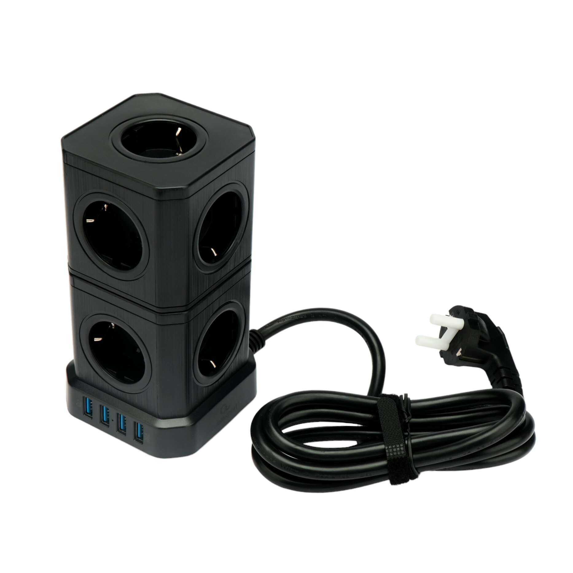 Сетевой фильтр Cablexpert Tower, 9 розеток, 4хUSB, 2м, черный, коробка