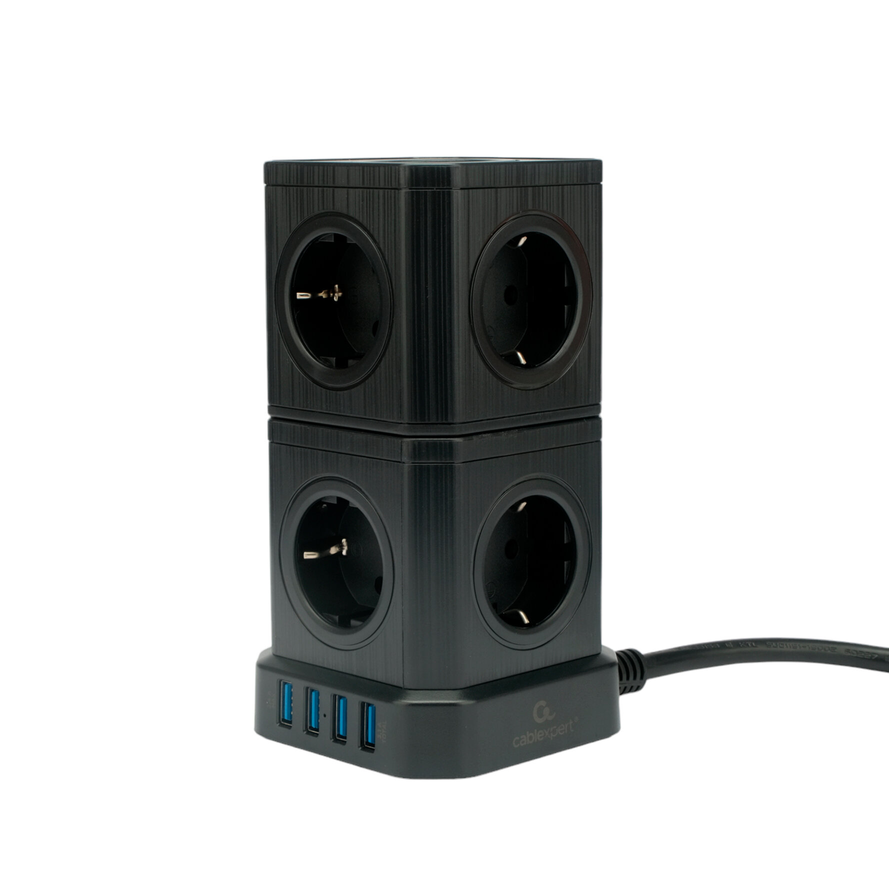 Сетевой фильтр Cablexpert Tower, 4 розетки, 3xUSB, 2м, черный, коробка