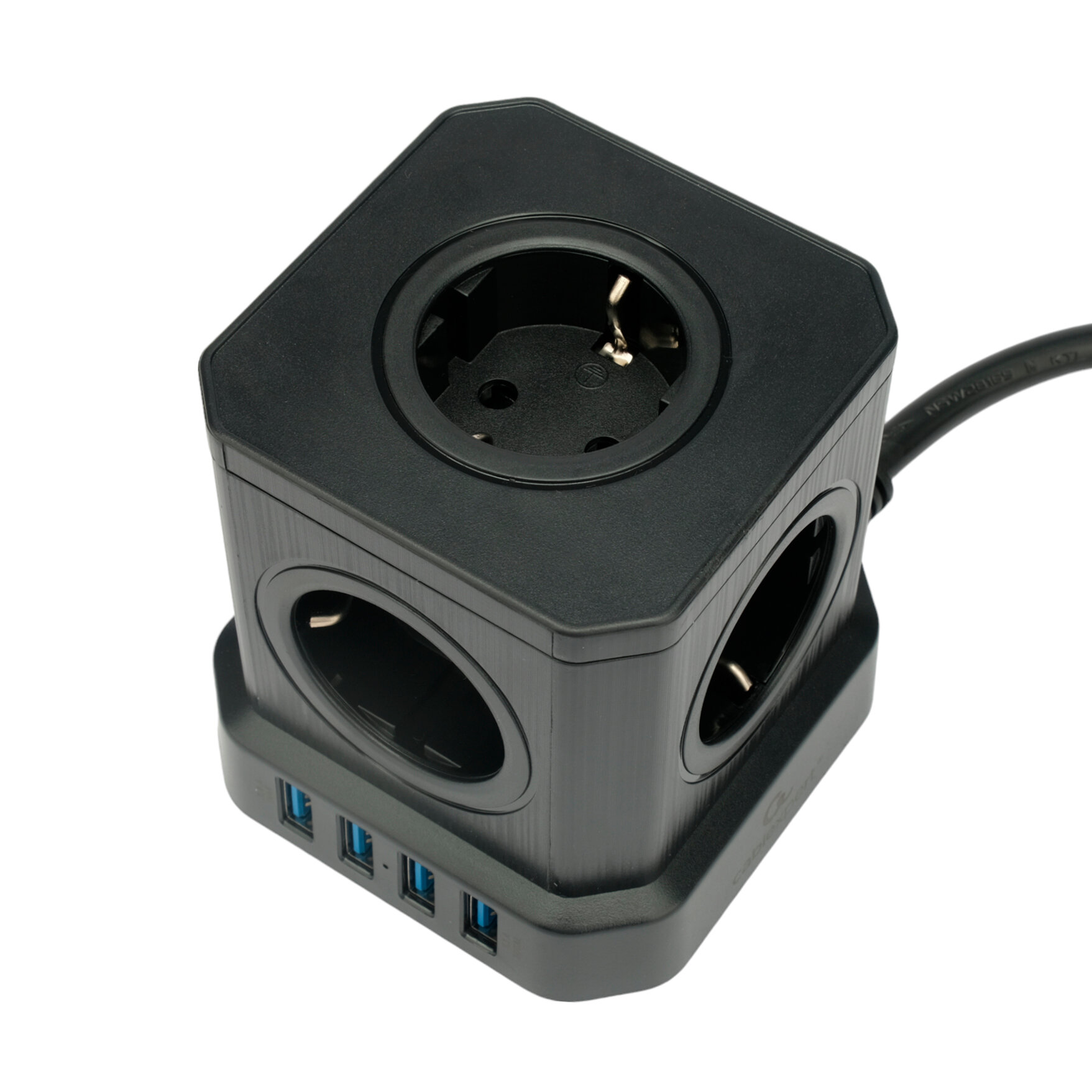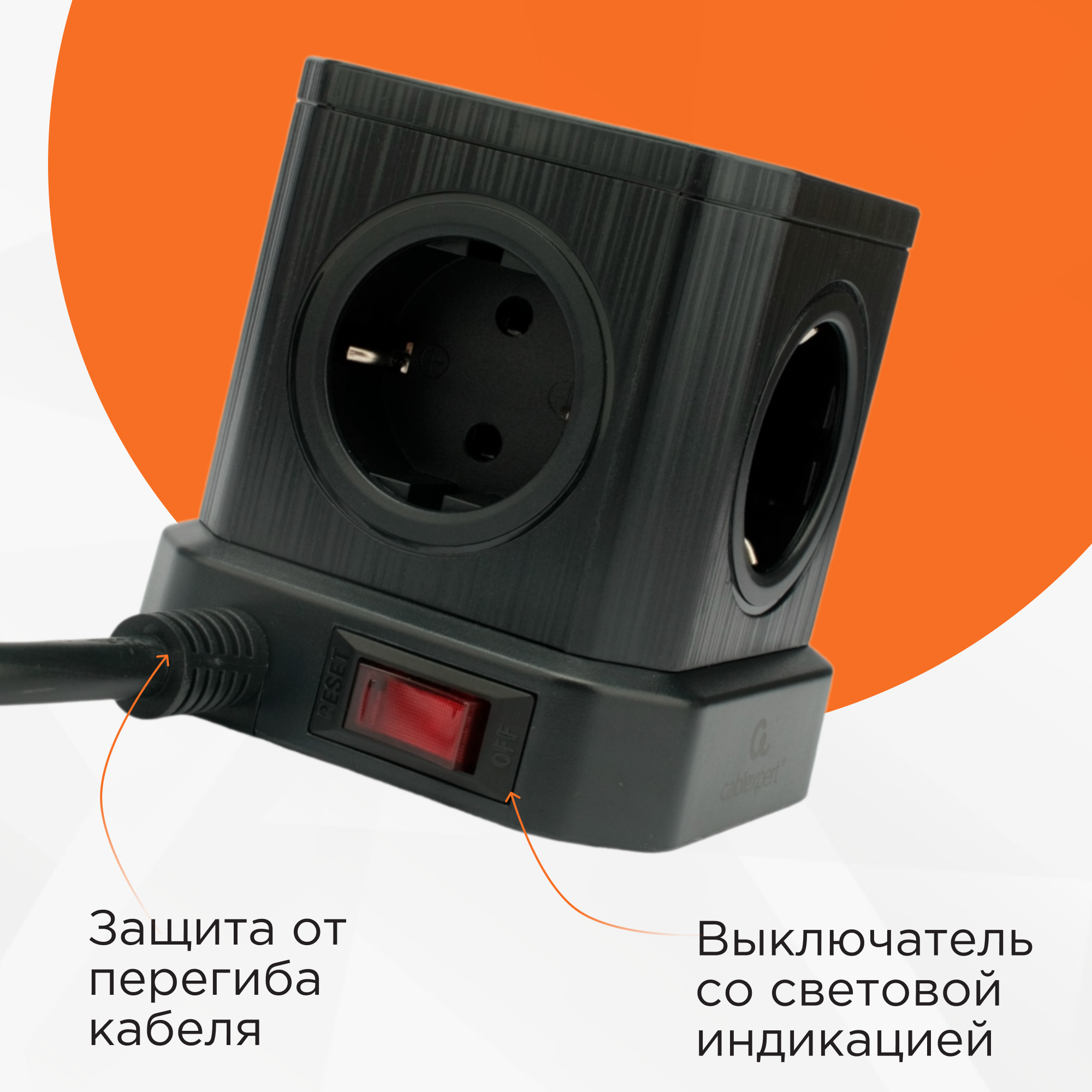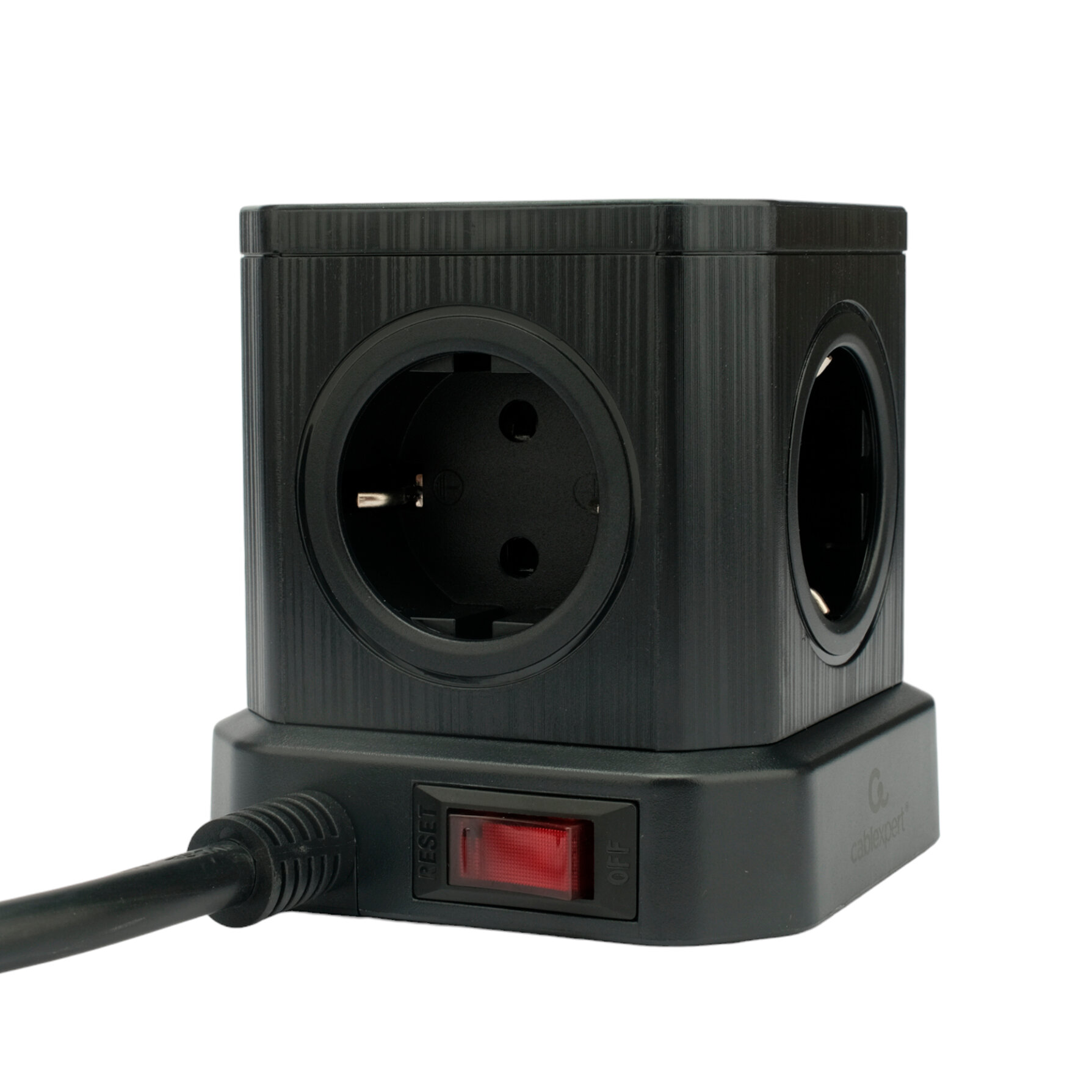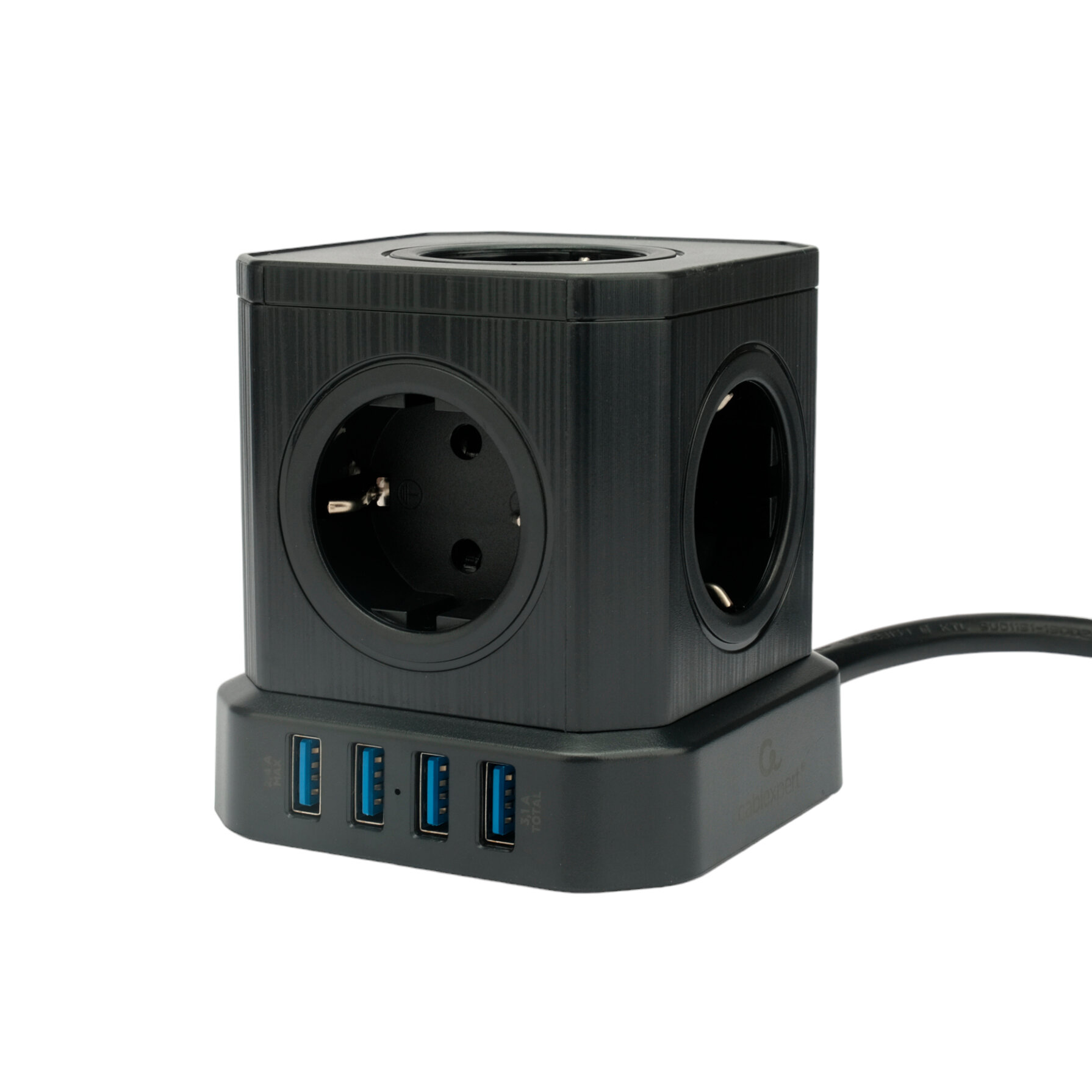 Сетевой фильтр Cablexpert Cube, 3 розетки, 1xType-C, 3xUSB, 1.5м, черный, коробка