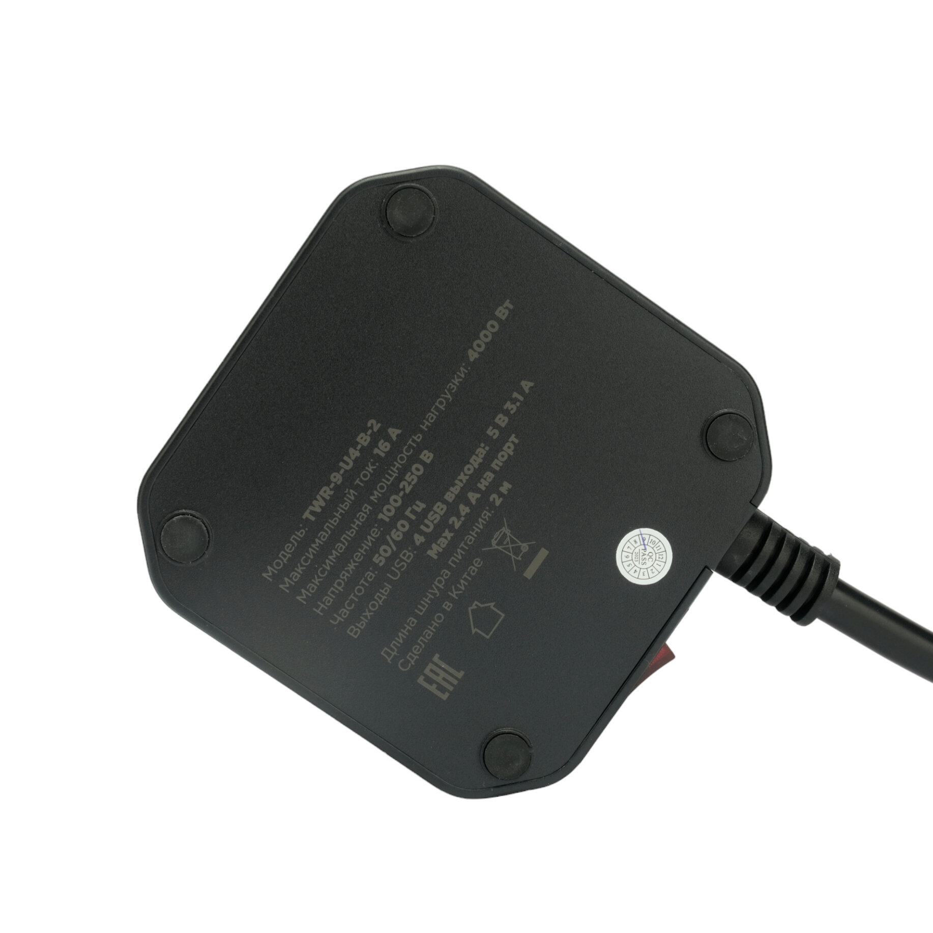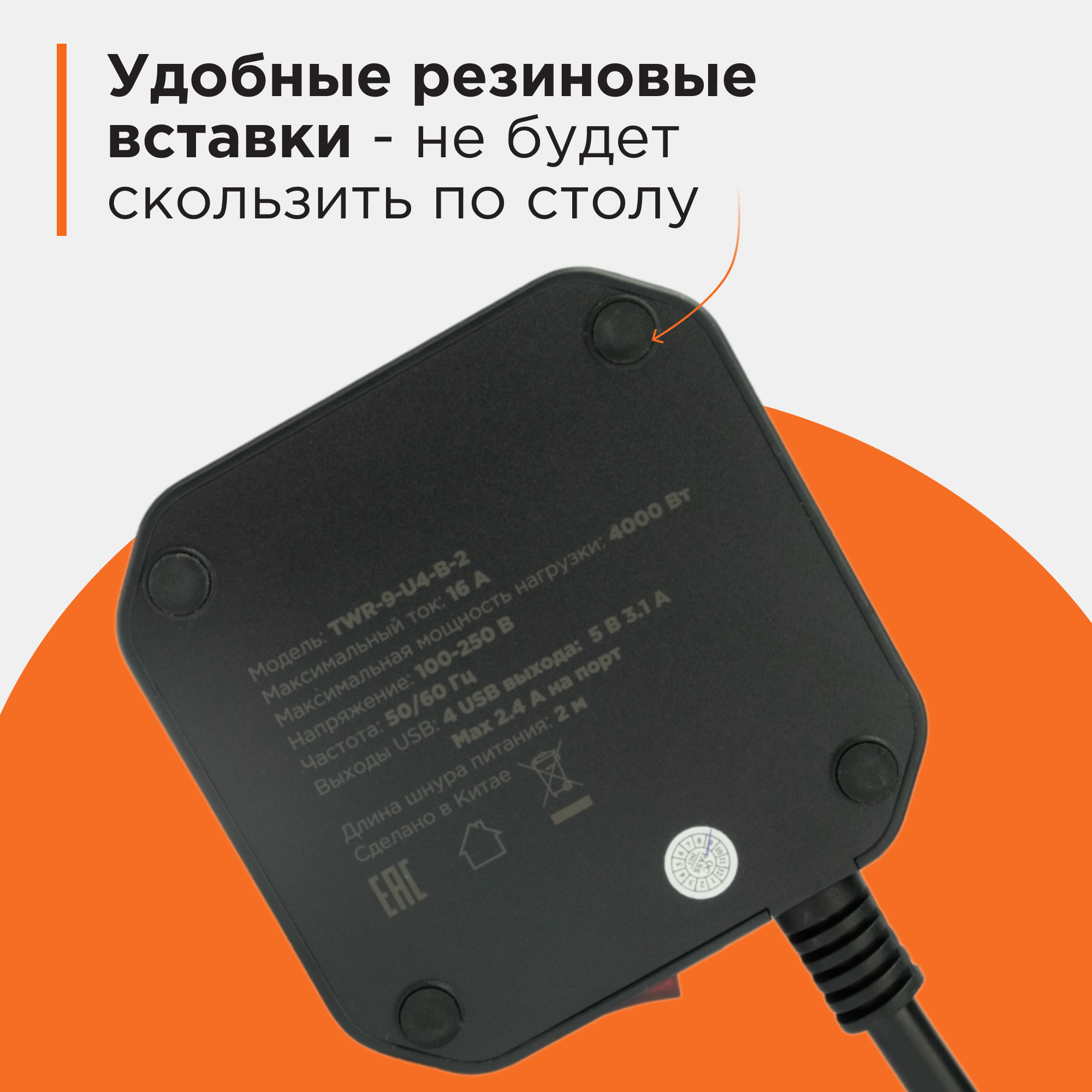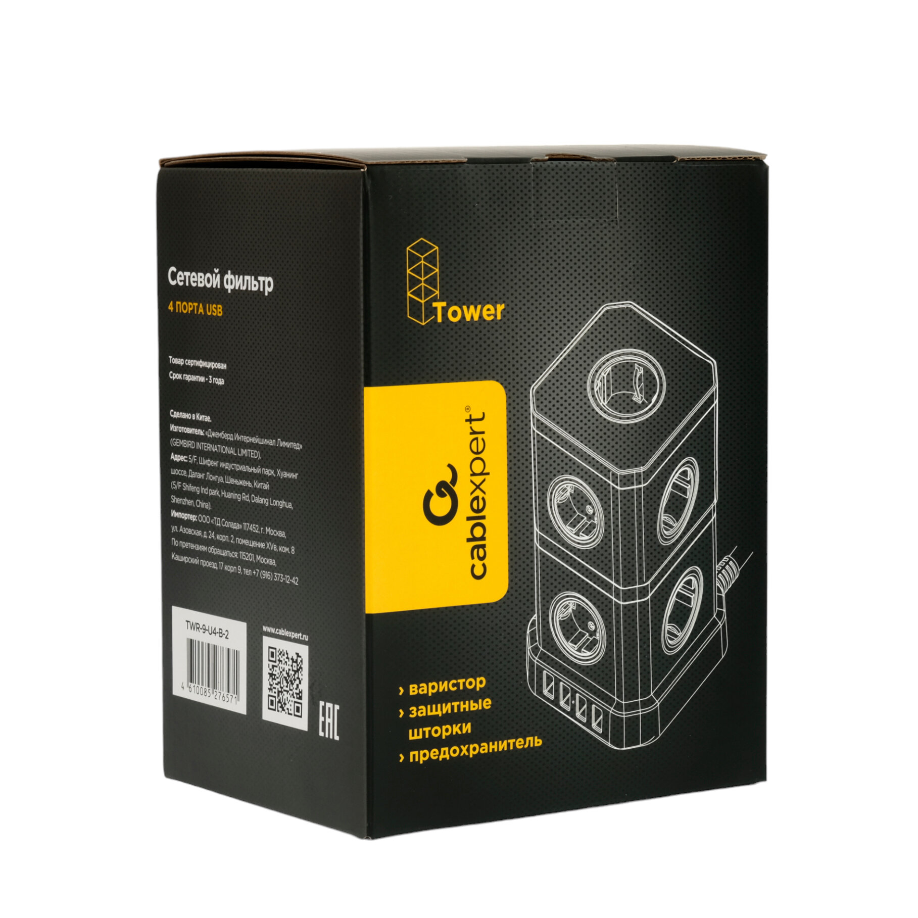Купить Сетевой фильтр Cablexpert Tower черный 16А 4хUSB 3.1А 2м с выключателем и заземлением уровень защиты 4+ TWR-9-U4-B-2