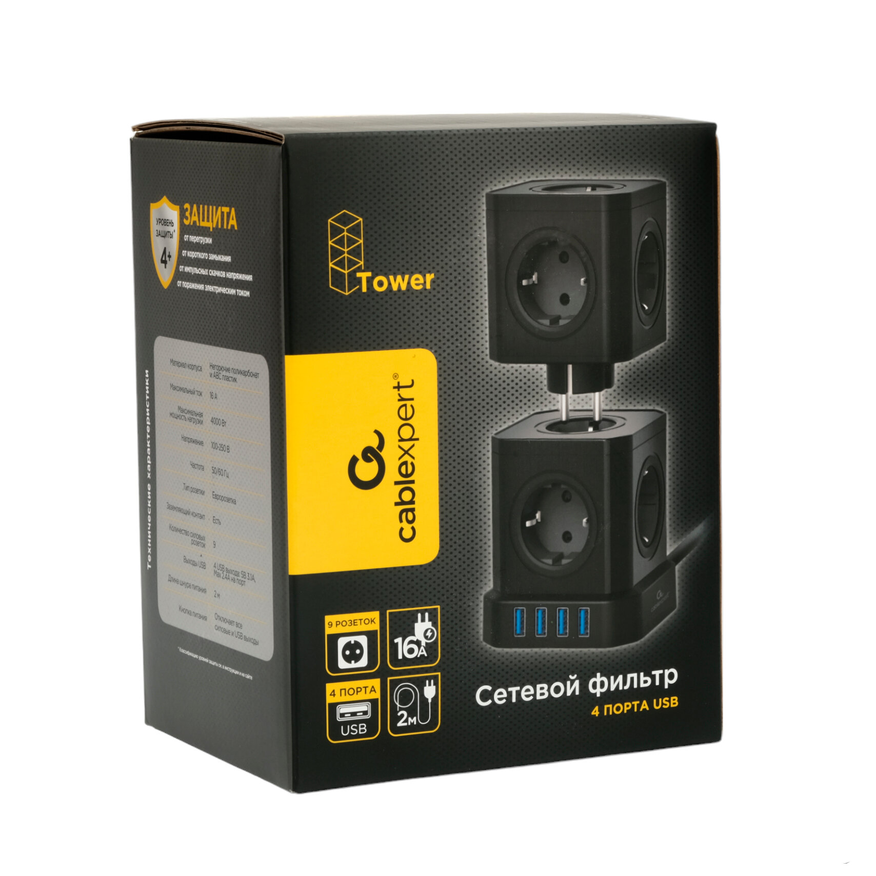 Сетевой фильтр Cablexpert Tower 9 розеток 16А 4хUSB 3.1А 2 метра уровень защиты 4+ черный