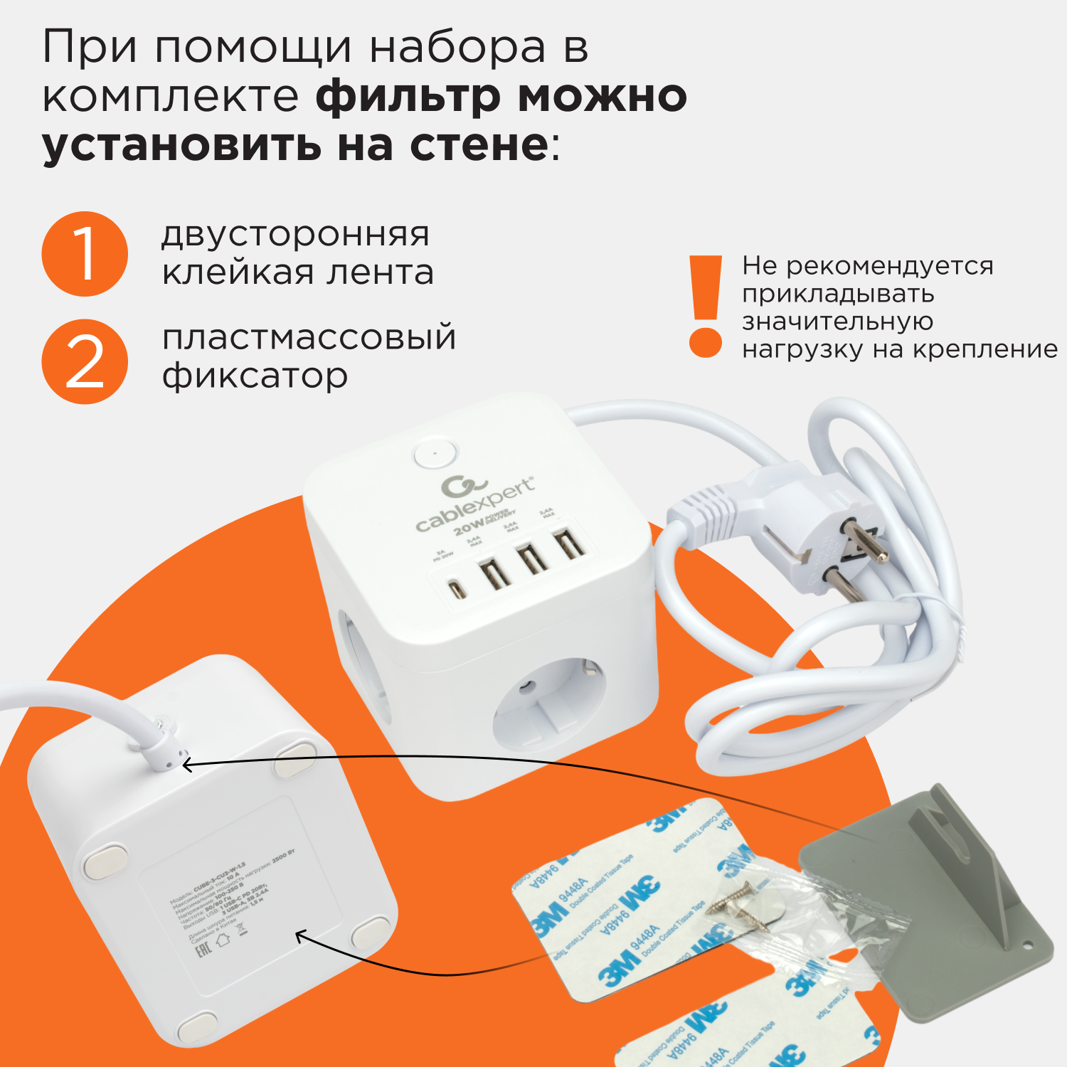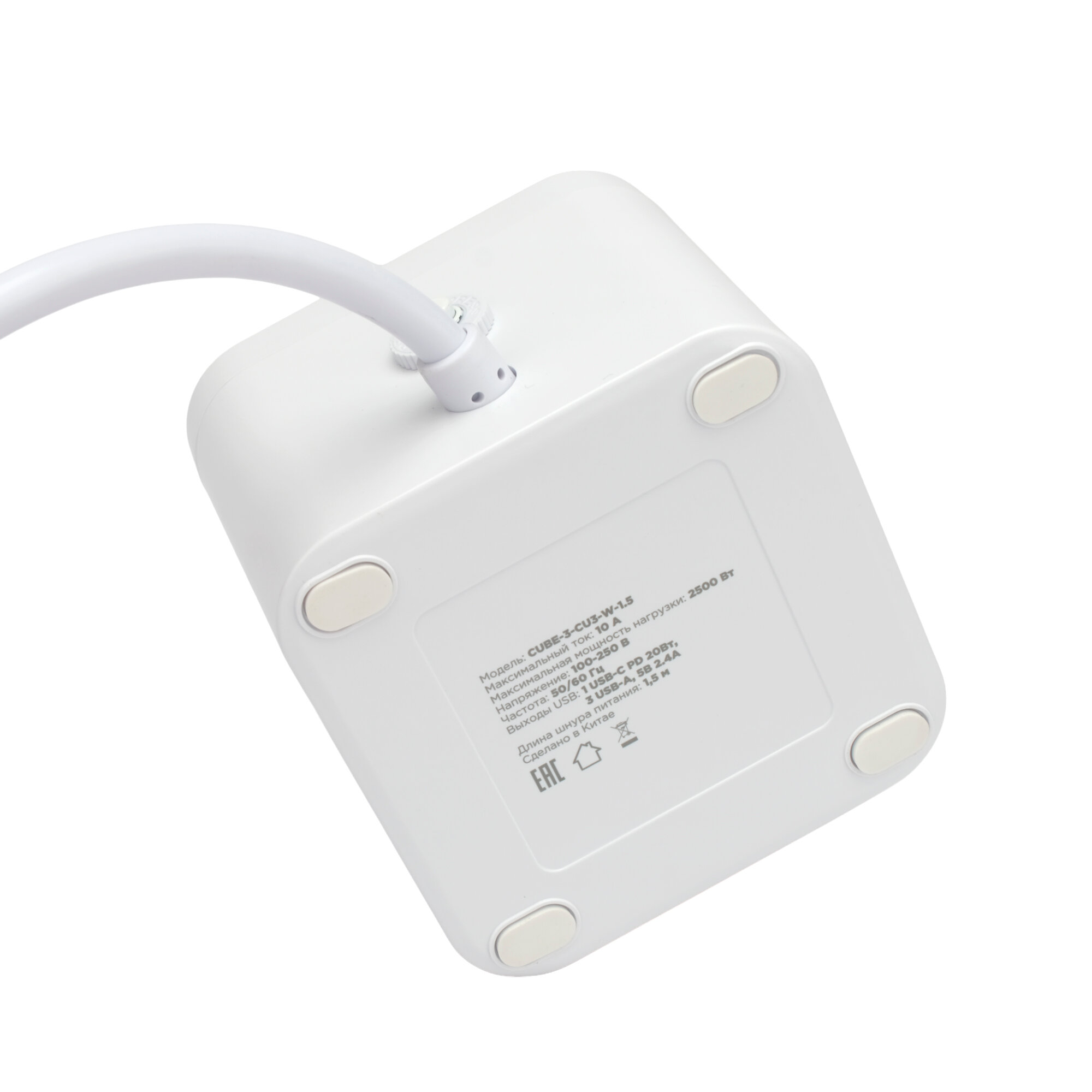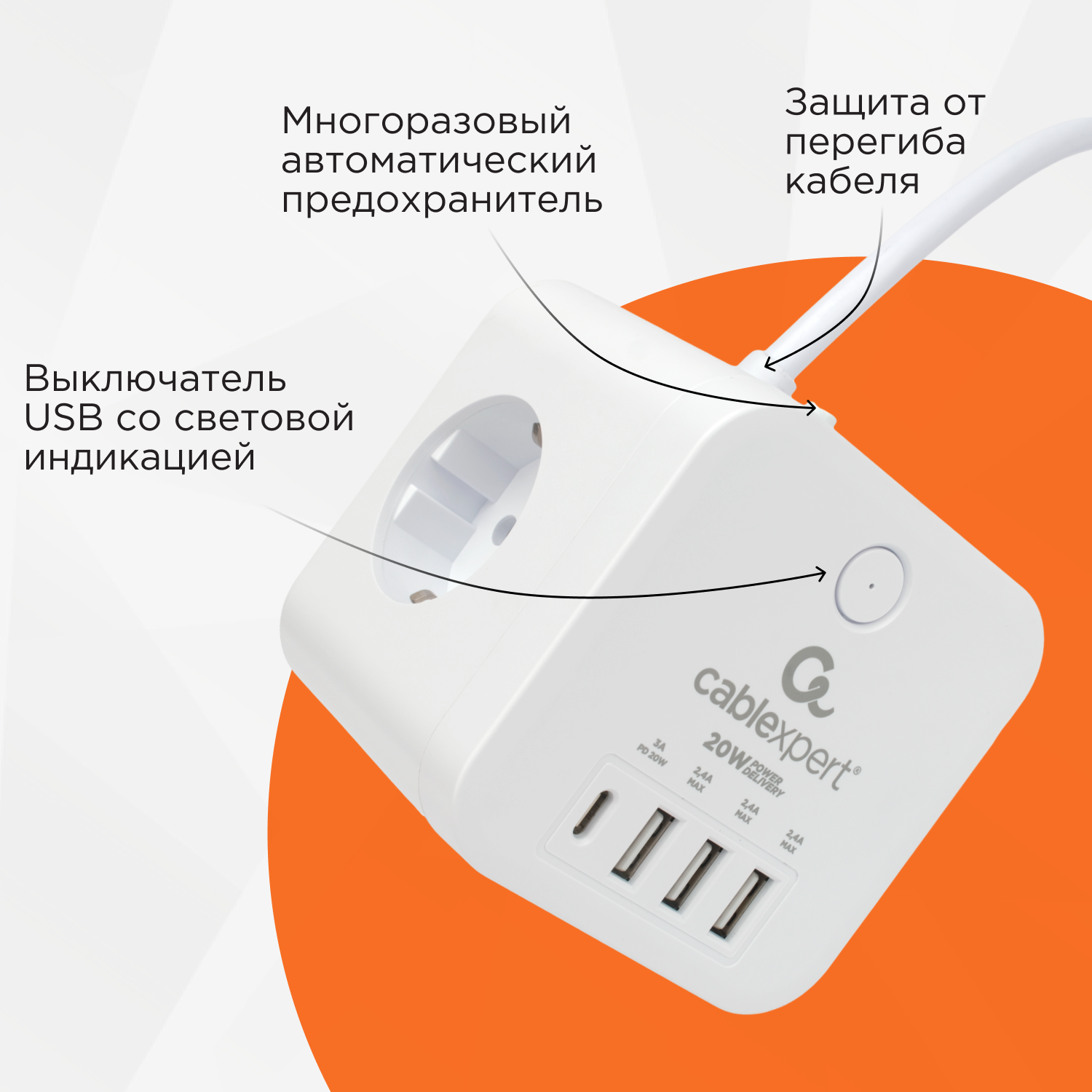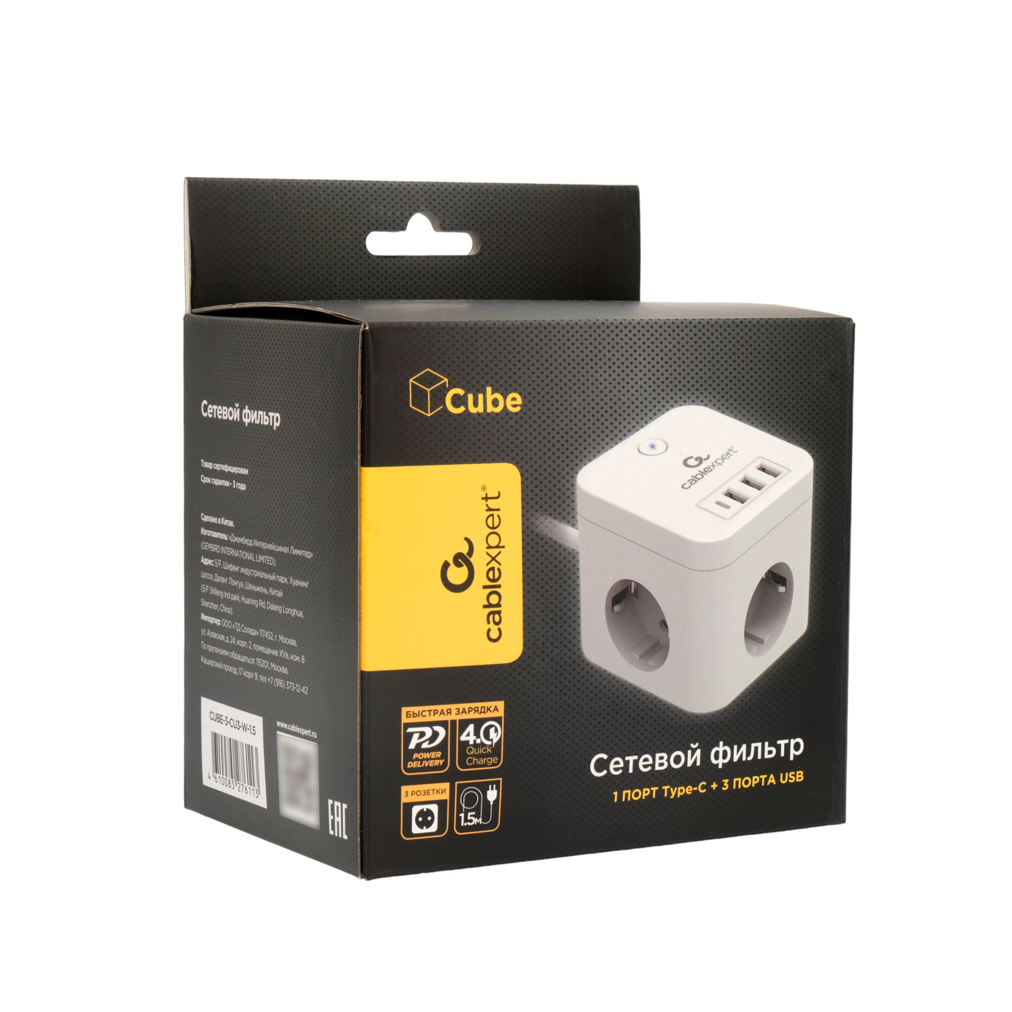 Купить Сетевой фильтр Cablexpert Cube белый 10А 1xType-C PD 3xUSB 1.5 метра с заземлением выключателем и защитными шторками уровень защиты 4+ CUBE-3-CU3-W-1.5