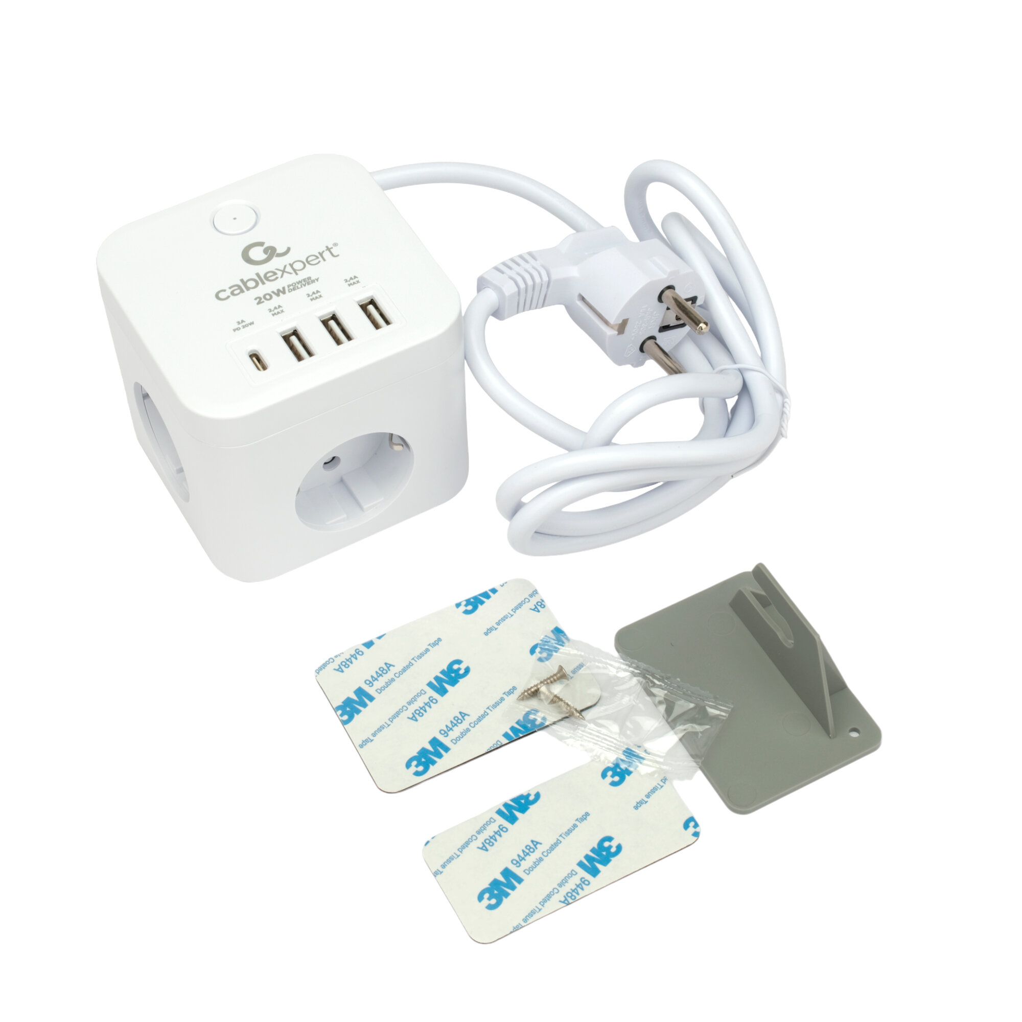 Сетевой фильтр Cablexpert Cube, 3 розетки, 1xType-C, 3xUSB, 1.5м, белый, коробка