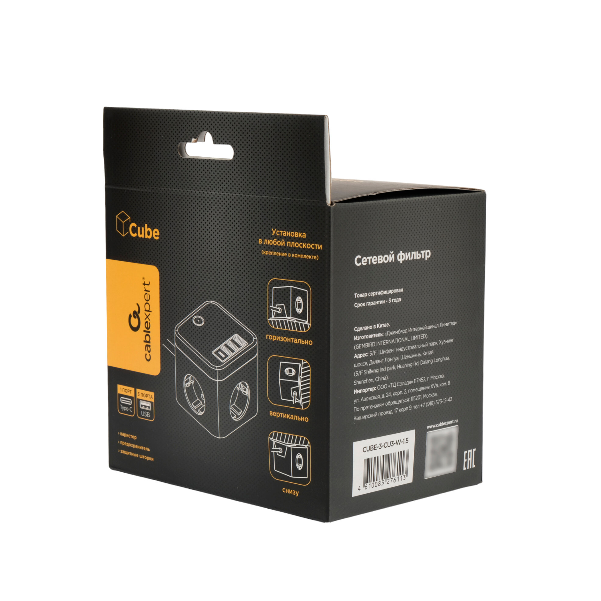 СохранитьСетевой фильтр Cablexpert Cube белый 10А 1xType-C PD 3xUSB 1.5 метра с заземлением выключателем и защитными шторками уровень защиты 4+ CUBE-3-CU3-W-1.5 интересное: