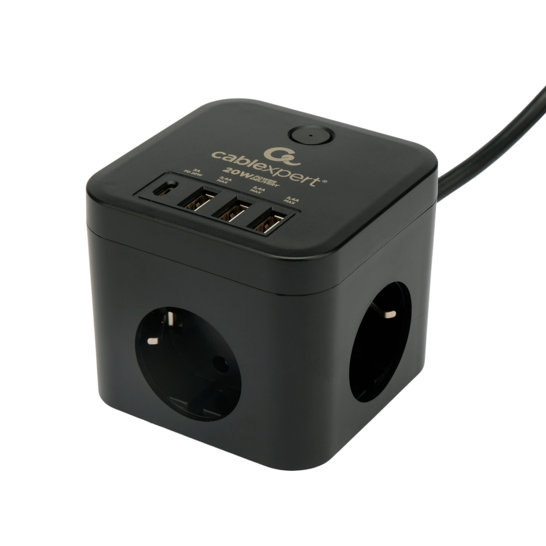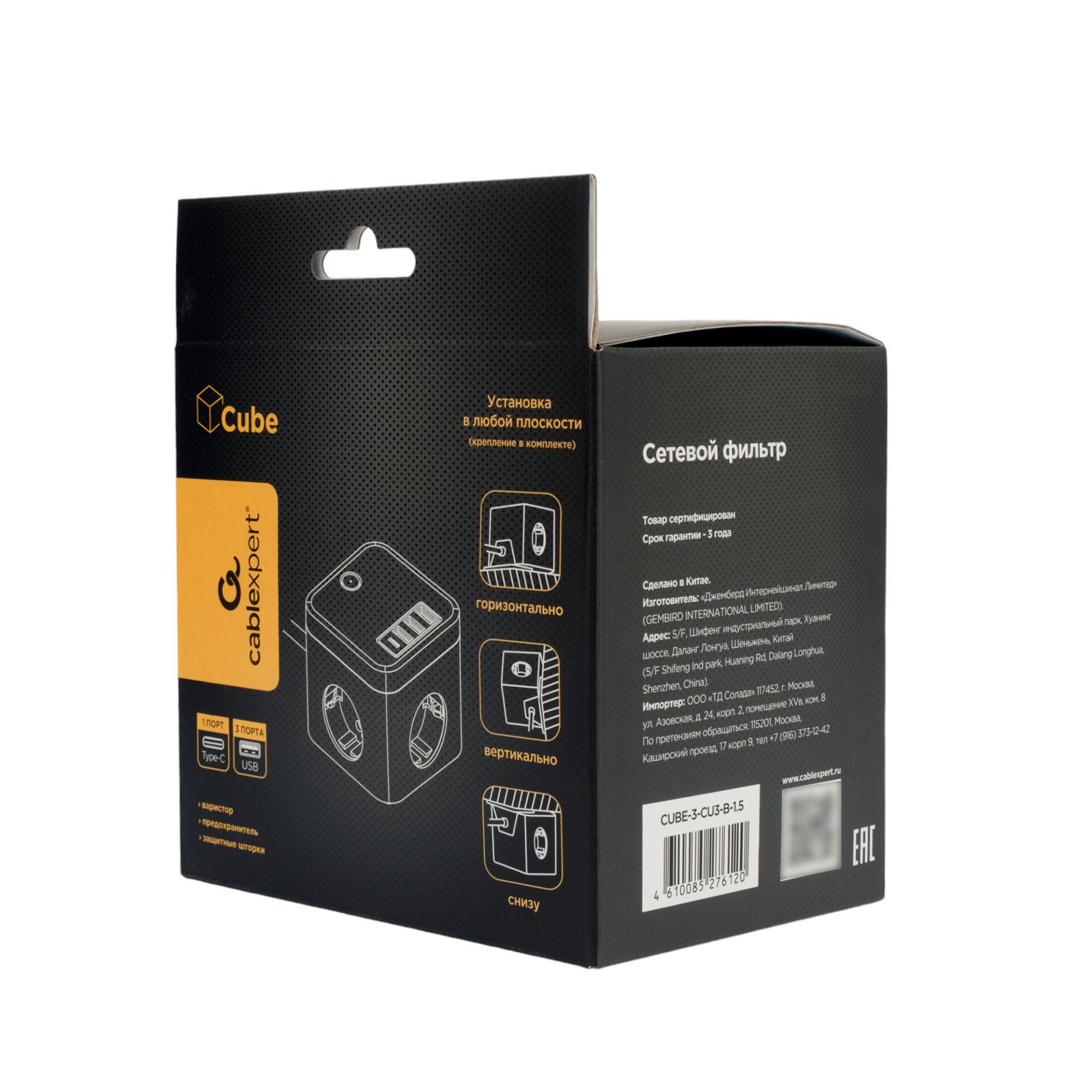 Сетевой фильтр Cablexpert Cube, 3 розетки, 1xType-C, 3xUSB, 1.5м, черный, коробка