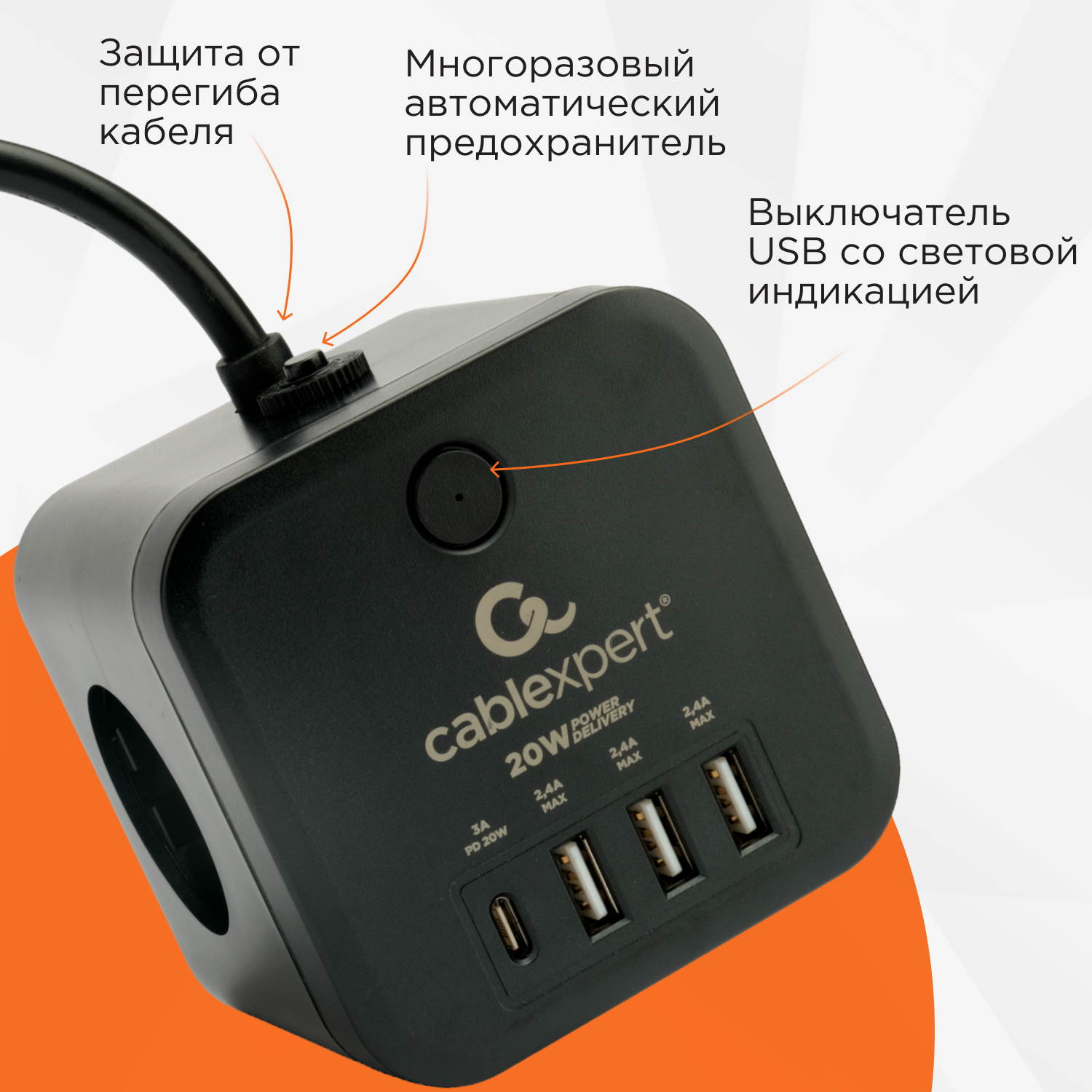 Сетевой фильтр Cablexpert Cube белый 10А 1xType-C PD 3xUSB 1.5 метра с заземлением выключателем и защитными шторками уровень защиты 4+ CUBE-3-CU3-W-1.5