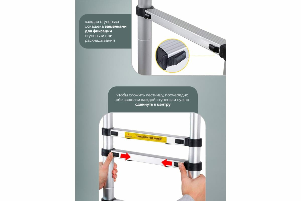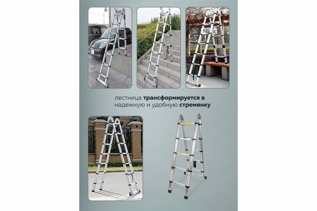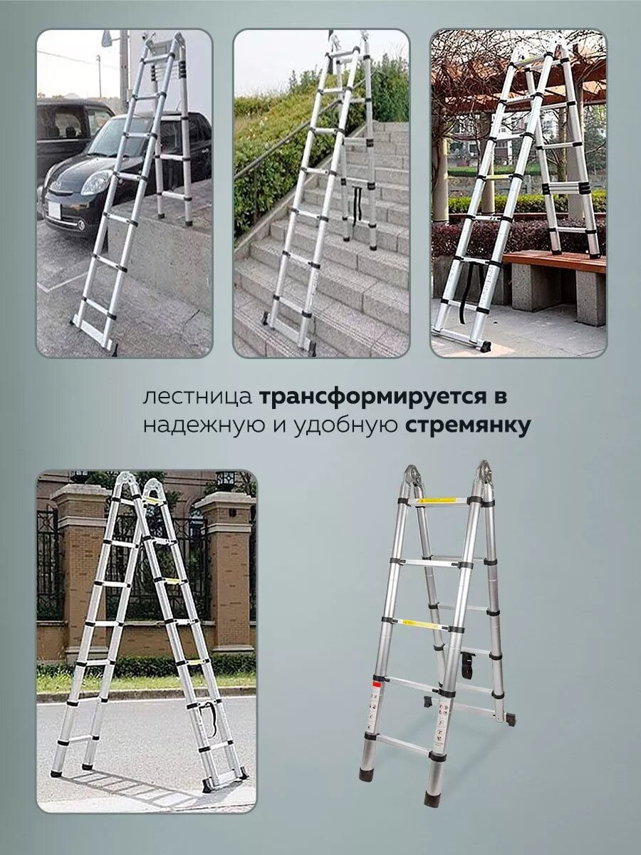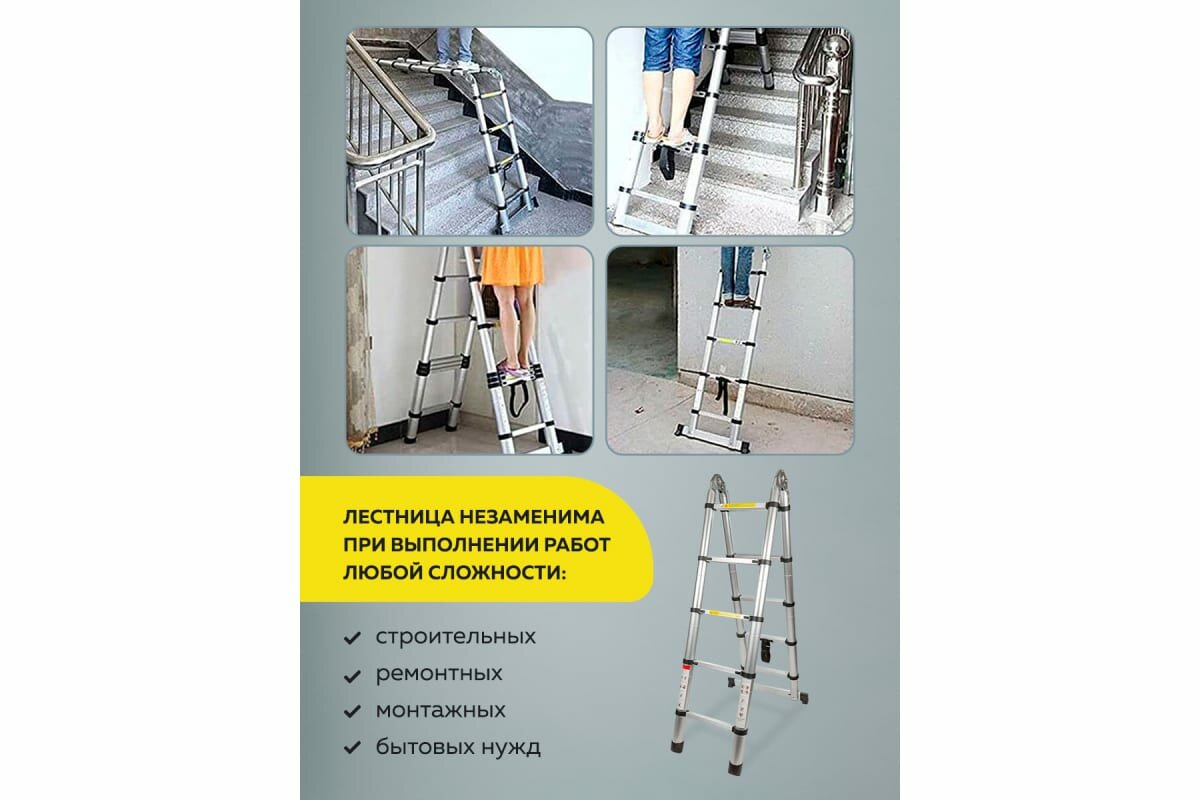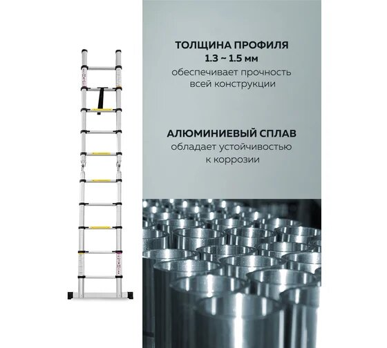 Лестница-стремянка телескопическая алюминиевая двухсекционная (2.6+2.6м,9+9ступенек, max нагрузка 150кг, вес 13.0кг)