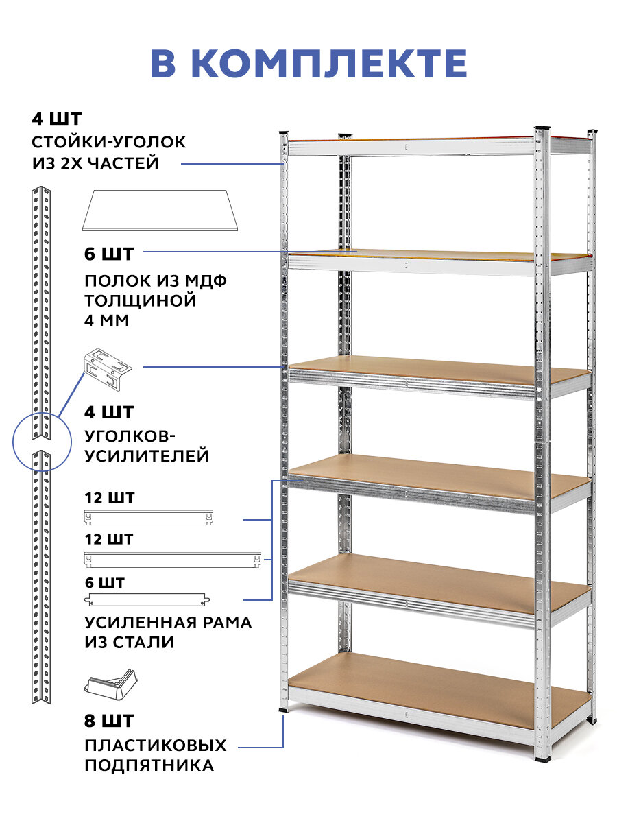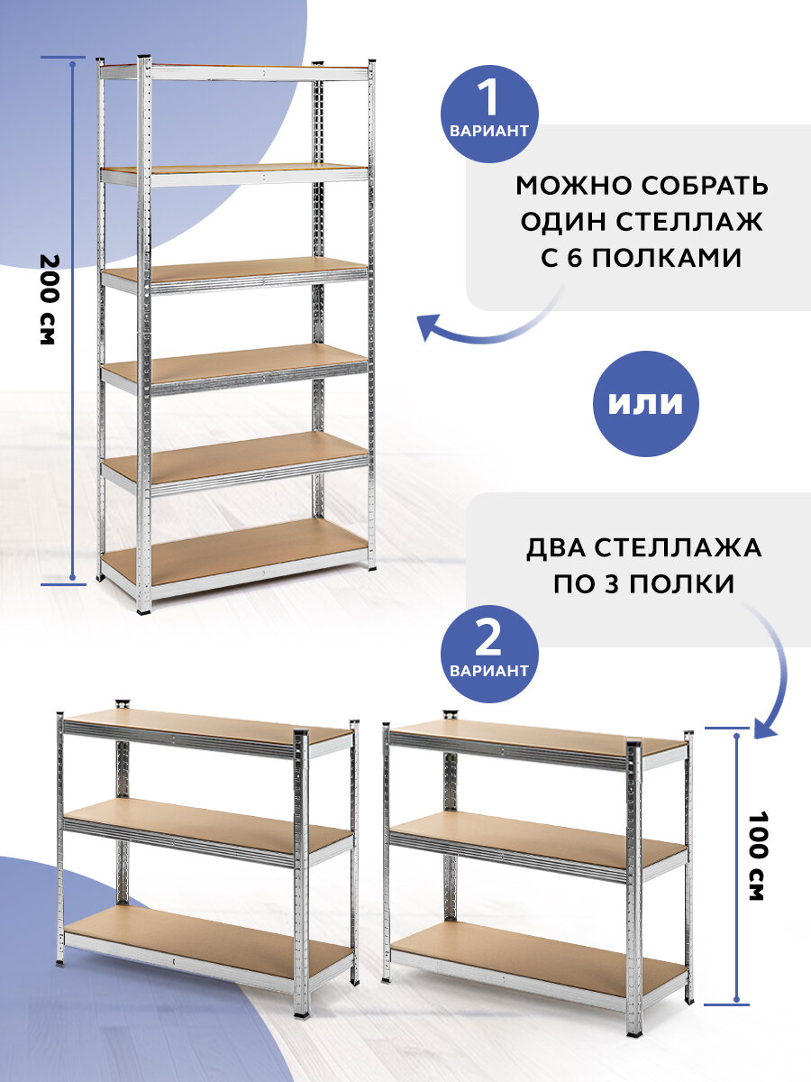 | Дополнительная информация | материал полки - влагостойкий МДФ 6.2 мм; максимальная нагрузка на полку - 175 кг, на весь стеллаж - 875 кг; высота полок регулируется с шагом 30 мм |