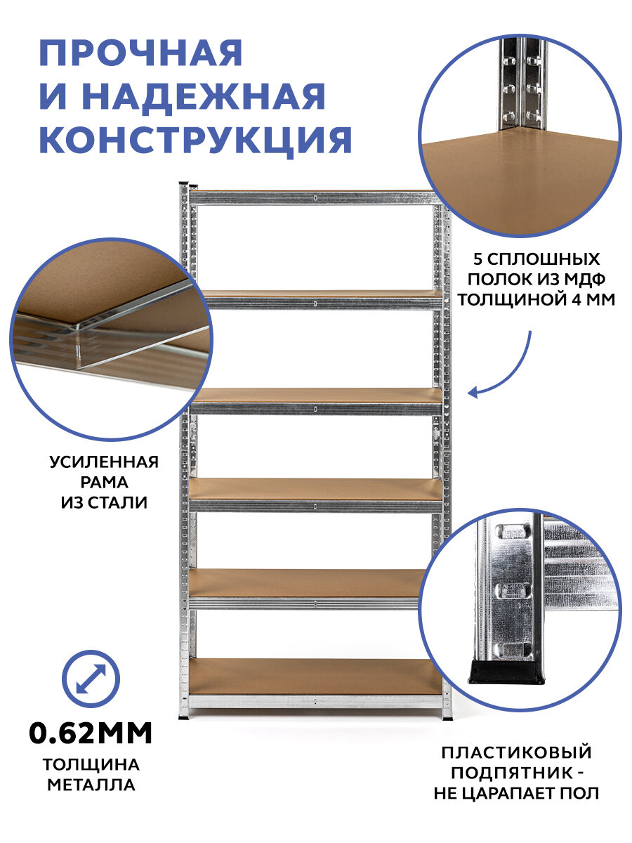 | Дополнительная информация | материал полки - влагостойкий МДФ 6.2 мм; максимальная нагрузка на полку - 175 кг, на весь стеллаж - 875 кг; высота полок регулируется с шагом 30 мм |