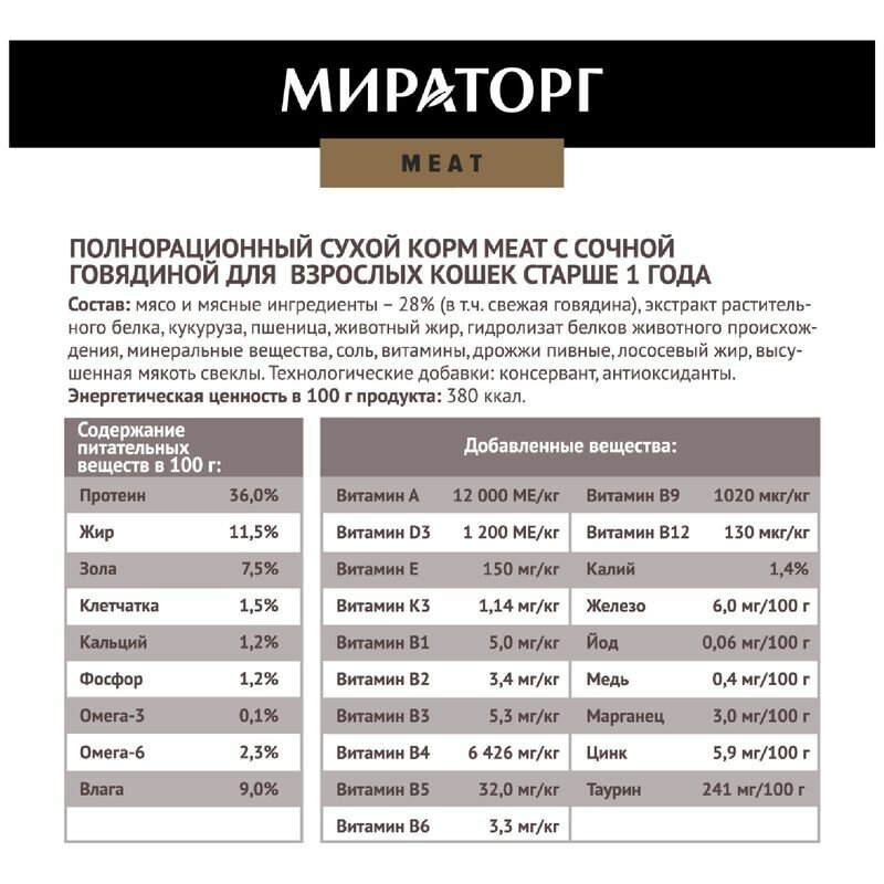 Купить Корм сухой Мираторг Meat с сочной говядиной для взрослых кошек старше 1 года, 1,5 кг