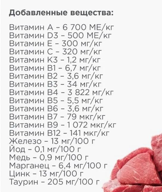 | Витамины | Витамин А – 6 700 МЕ/кг Витамин D3 – 500 МЕ/кг Витамин Е – 300 мг/кг Витамин С – 320 мг/кг Витамин К3 – 1,2 мг/кг Витамин В1 – 6,7 мг/кг Витамин В2 – 3,6 мг/кг Витамин В3 – 34 мг/кг Витамин B4 – 3 822 мг/кг Витамин В5 – 5,5 мг/кг Витамин В6 – 3,6 мг/кг Витамин В7 – 79 мкг/кг Витамин B9 – 1 072 мкг/кг Витамин B12 – 141 мкг/кг |