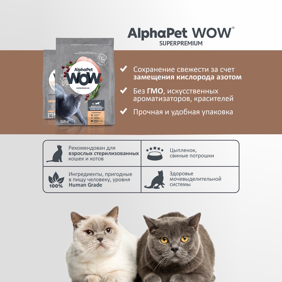 AlphaPet WOW Сухой полнорационный корм Superpremium с Индейкой и потрошками, для взрослых стерилизованных кошек и котов, 750 г, 2 уп