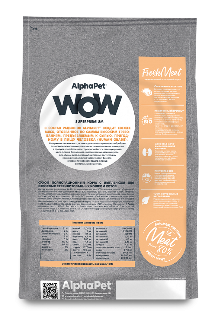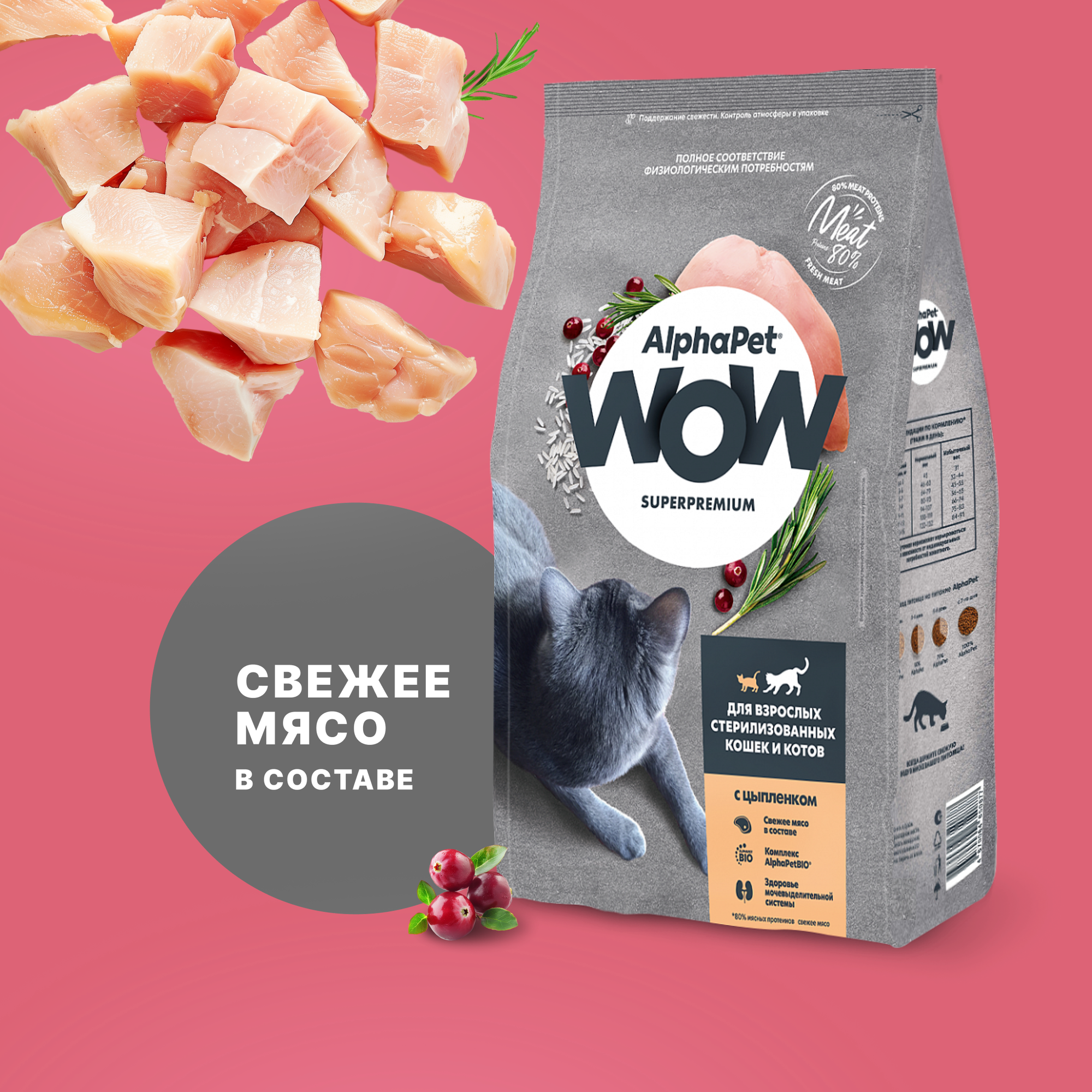 Корм AlphaPet WOW Superpremium для стерилизованных кошек и котов, c цыпленком,1.5 кг