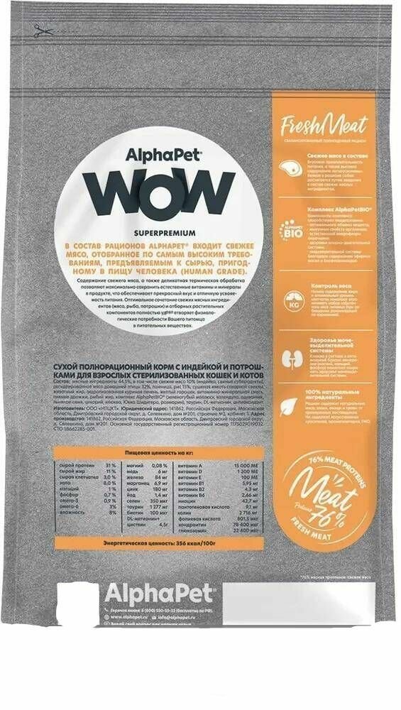 Купить Корм AlphaPet WOW Superpremium для стерилизованных кошек и котов, c индейкой и потрошками, 1.5 кг