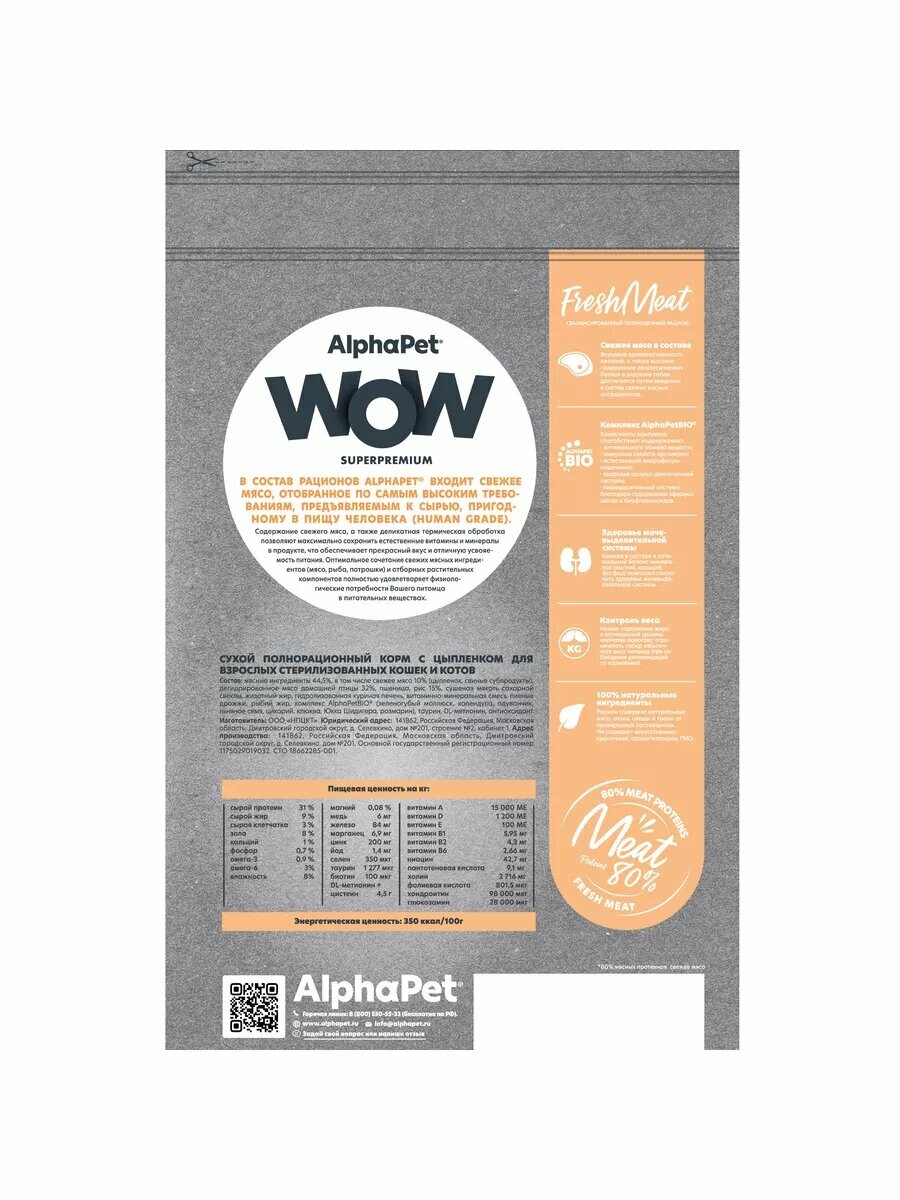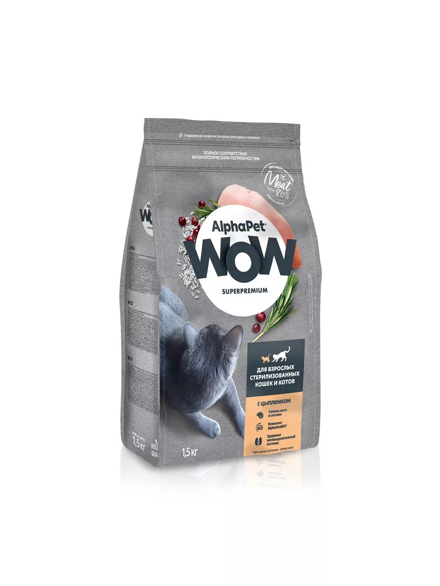 Корм AlphaPet WOW Superpremium для стерилизованных кошек и котов, c цыпленком,1.5 кг