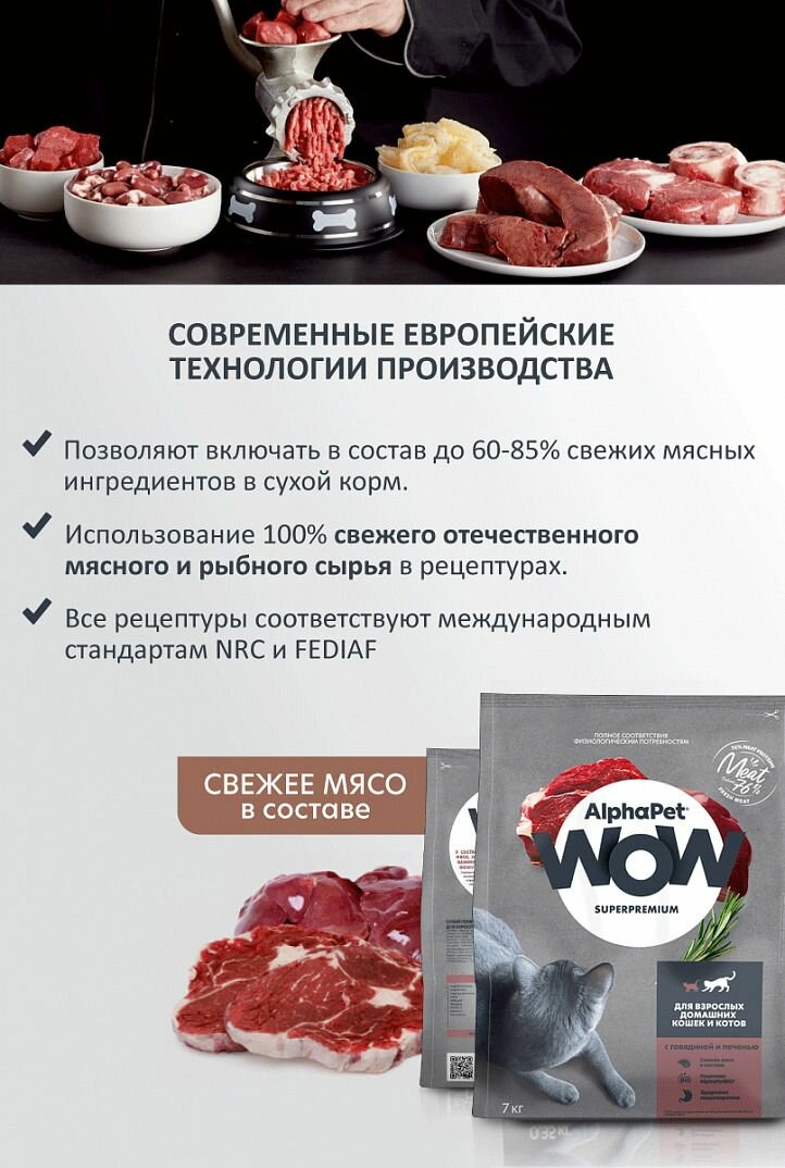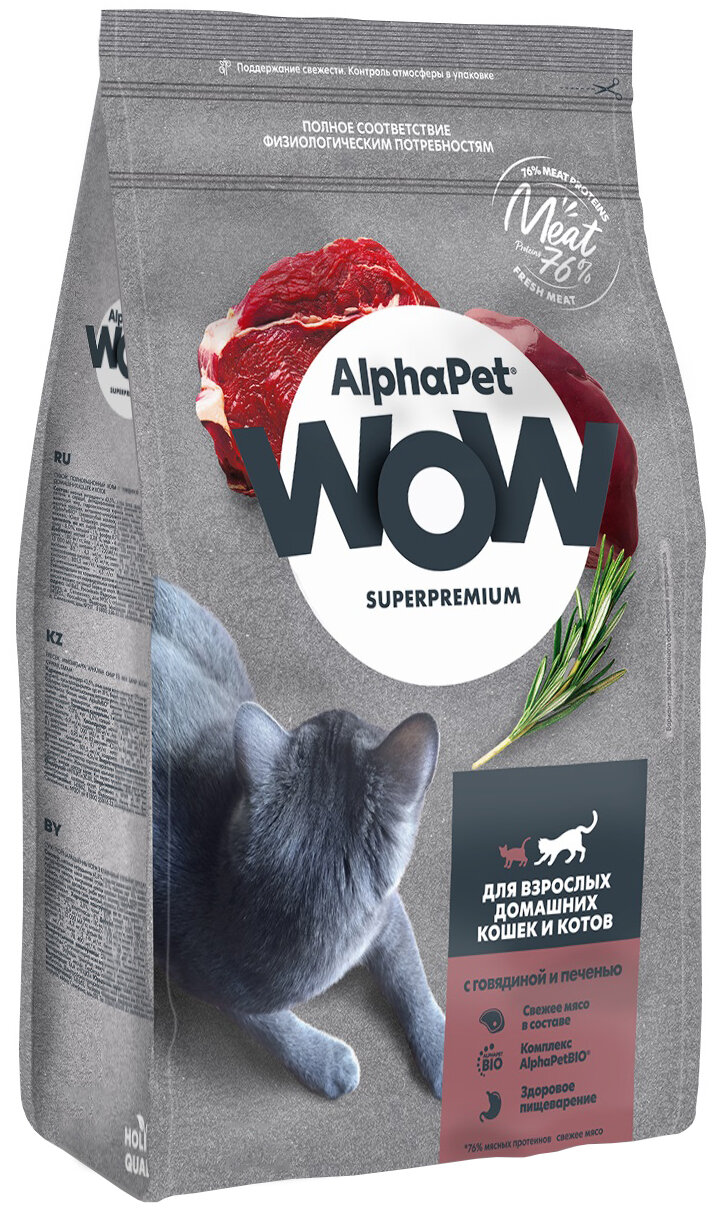 Купить Alphapet WOW Сухой полнорационный корм c говядиной и печенью для взрослых домашних кошек и котов Superpremium 350 гр/