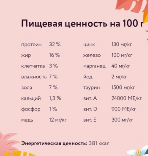 | Минеральные вещества | кальций 1,1%, фосфор 0,9%, медь 12 мг/кг, цинк 130 мг/кг, железо 100 мг/кг, марганец 40 мг/кг, йод 2 мг/кг, таурин 1500 мг/кг |