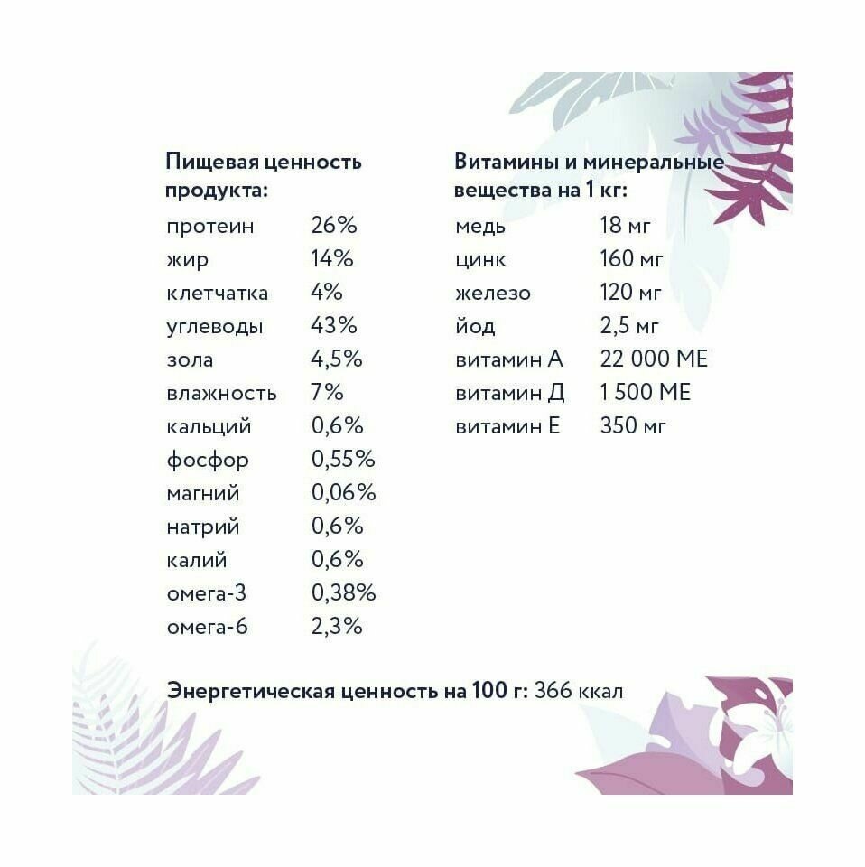 | Минеральные вещества | кальций 1,1%, фосфор 0,9%, медь 12 мг/кг, цинк 130 мг/кг, железо 100 мг/кг, марганец 40 мг/кг, йод 2 мг/кг, таурин 1500 мг/кг |