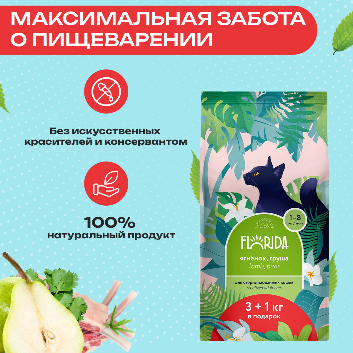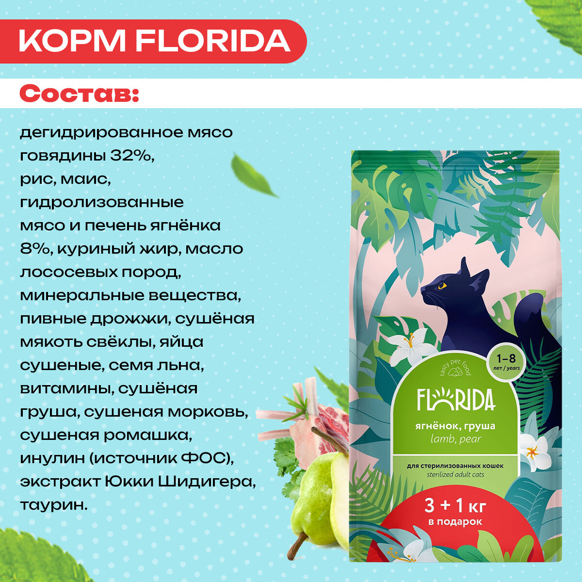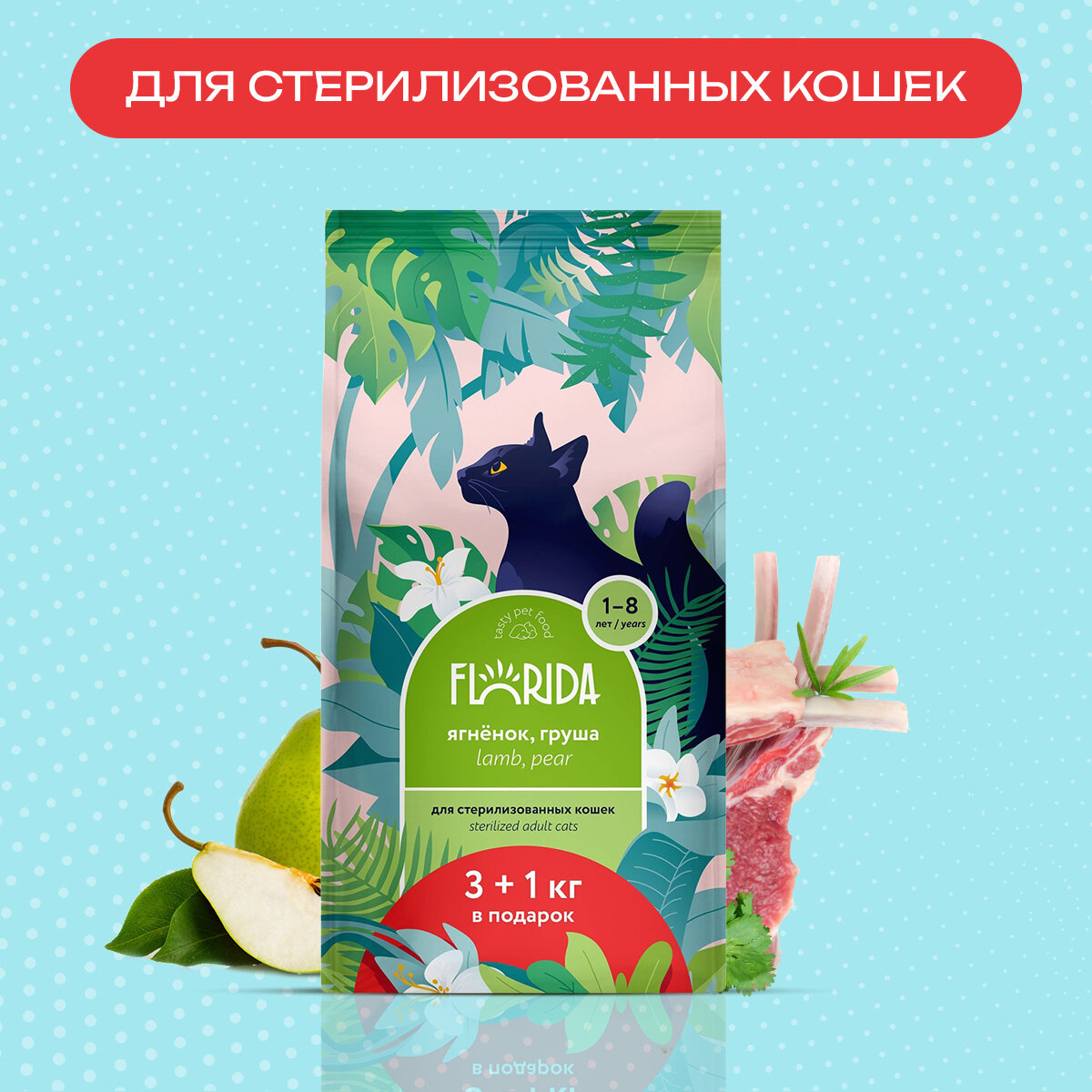 Купить Сухой корм FLORIDA для взрослых стерилизованных кошек: ягненок с грушей 3+1кг