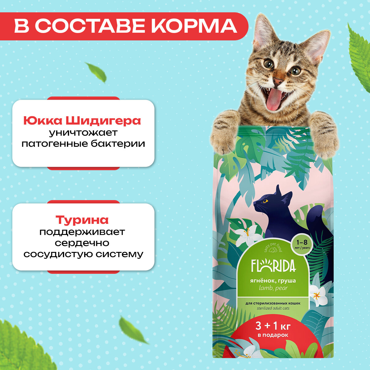 Florida сухой корм для взрослых стерилизованных кошек и кастрированных котов с индейкой и клюквой - 3+1 кг в подарок