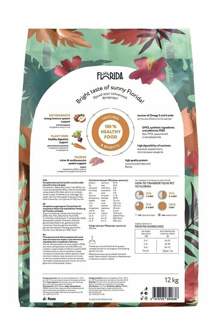Florida для взрослых кошек с чувствительным пищеварением с индейкой и яблоком / Флорида 4кг