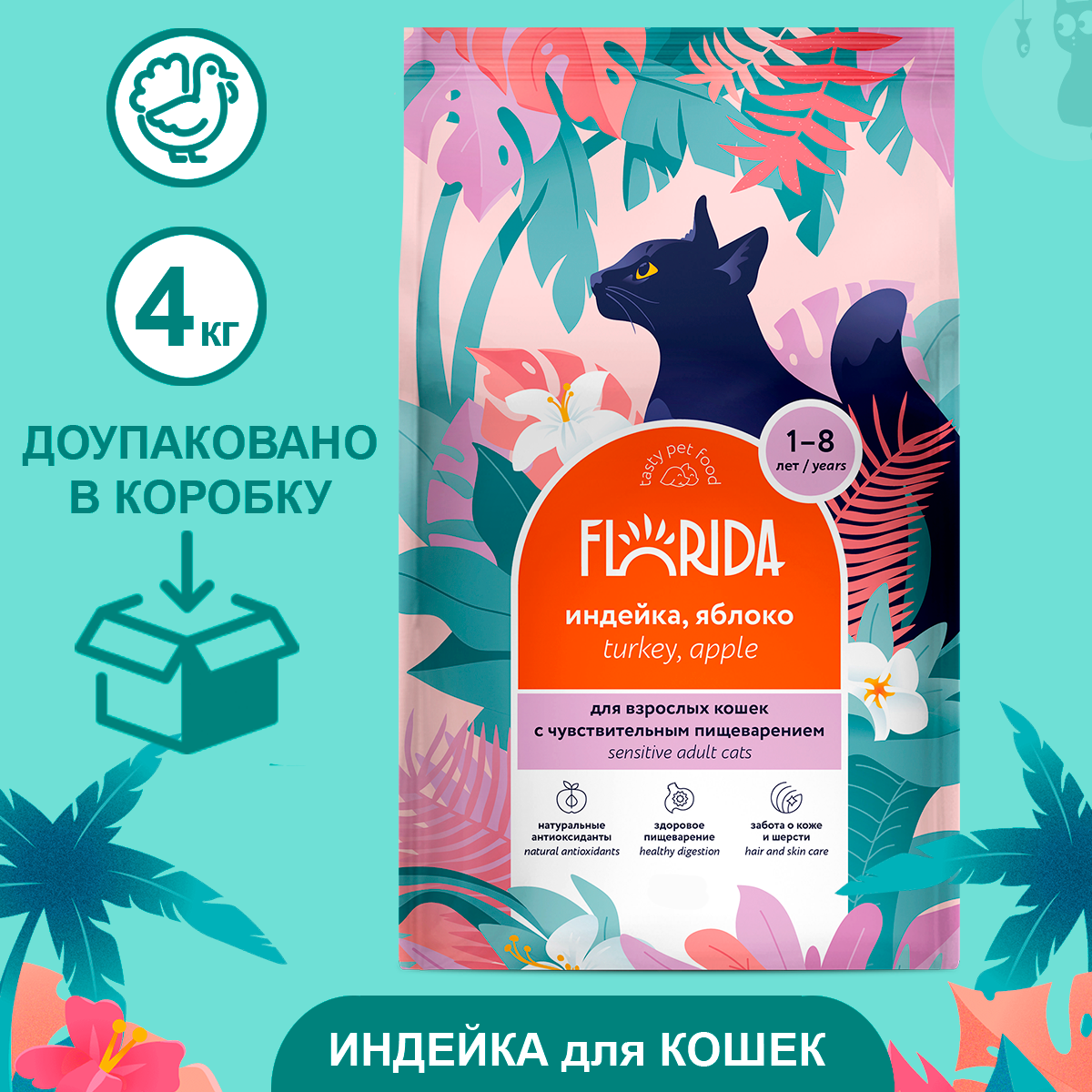 Florida сухой корм для взрослых кошек с чувствительным пищеварением Индейка и яблоки, 3+1кг