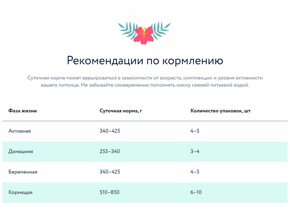 | Дополнительная информация | Переход с предыдущего рациона осуществлять постепенно, небольшими порциями в течение 5-7 дней. При кормлении необходимо учитывать активность и аппетит животного. Корм должен быть комнатной температуры. Содержимое открытой упаковки хранить при температуре +5°С и использовать в течение 2 дней. У кошки всегда должен быть доступ к свежей питьевой воде. |