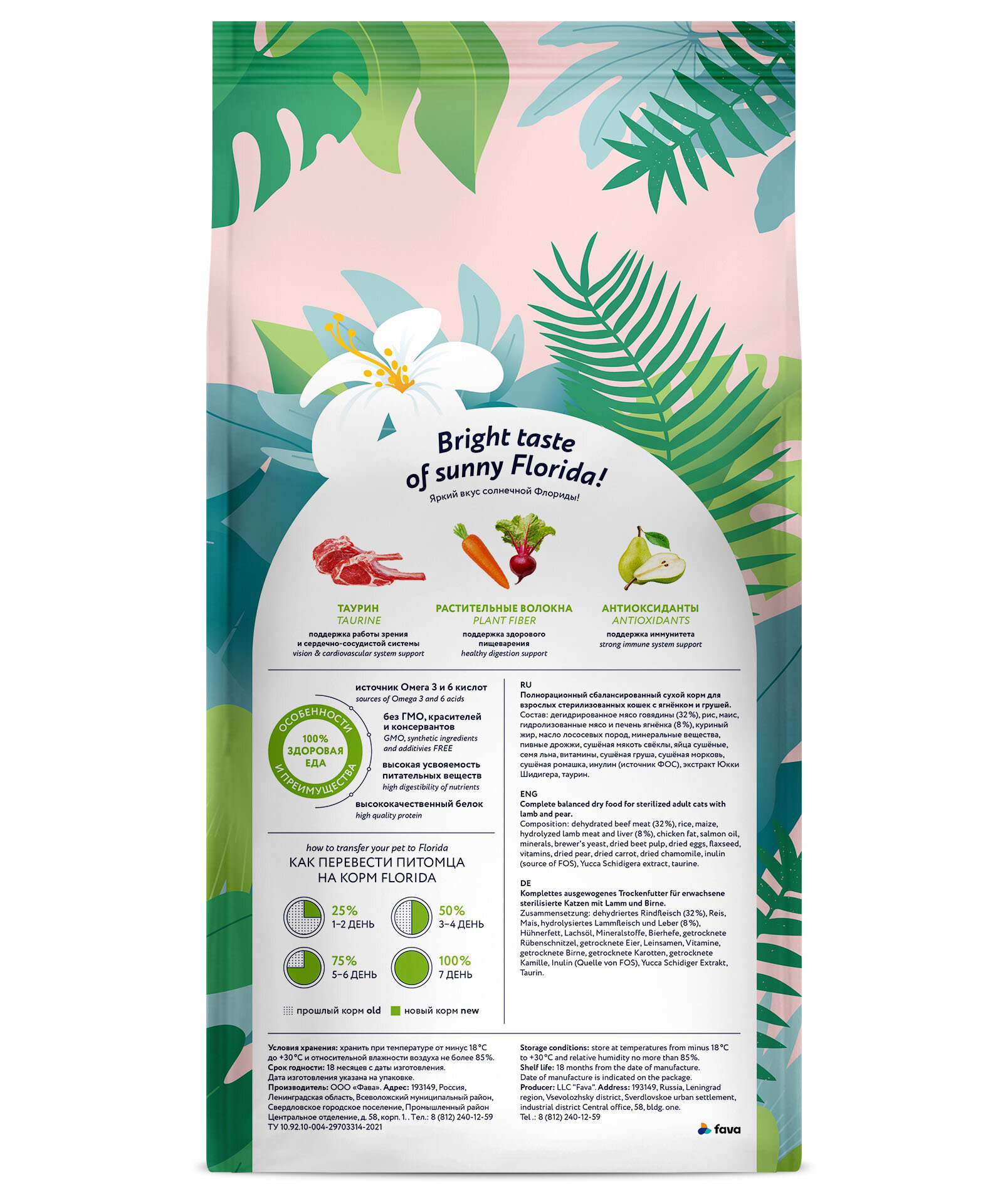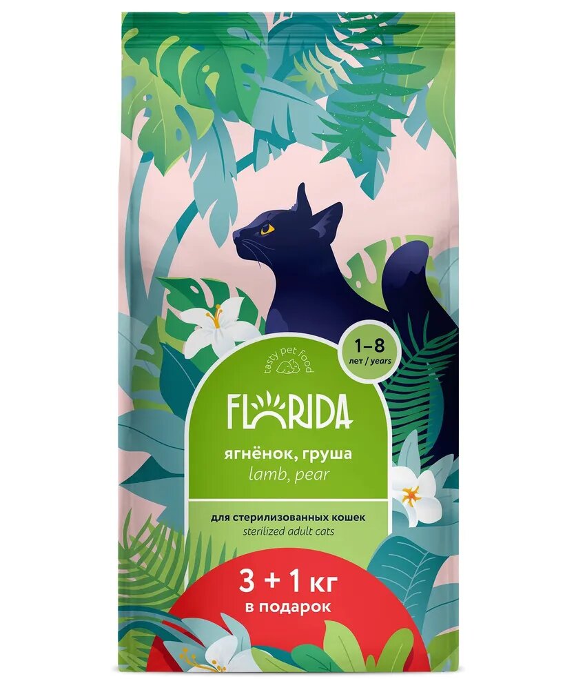 Сухой корм FLORIDA для взрослых стерилизованных кошек: ягненок с грушей 3+1кг