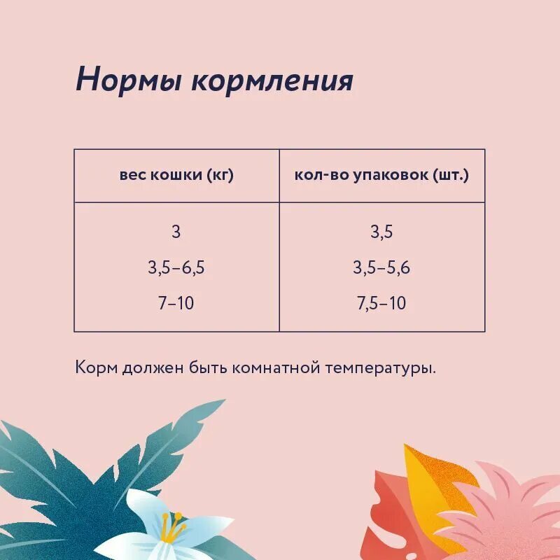 | Дополнительная информация | Переход с предыдущего рациона осуществлять постепенно, небольшими порциями в течение 5-7 дней. При кормлении необходимо учитывать активность и аппетит животного. Корм должен быть комнатной температуры. Содержимое открытой упаковки хранить при температуре +5°С и использовать в течение 2 дней. У кошки всегда должен быть доступ к свежей питьевой воде. |