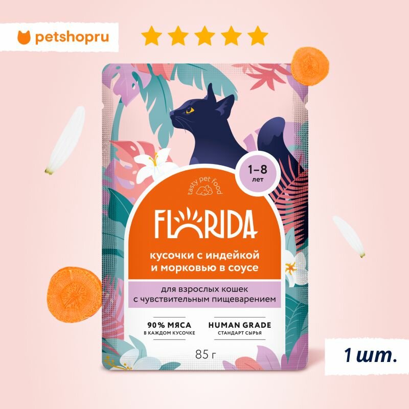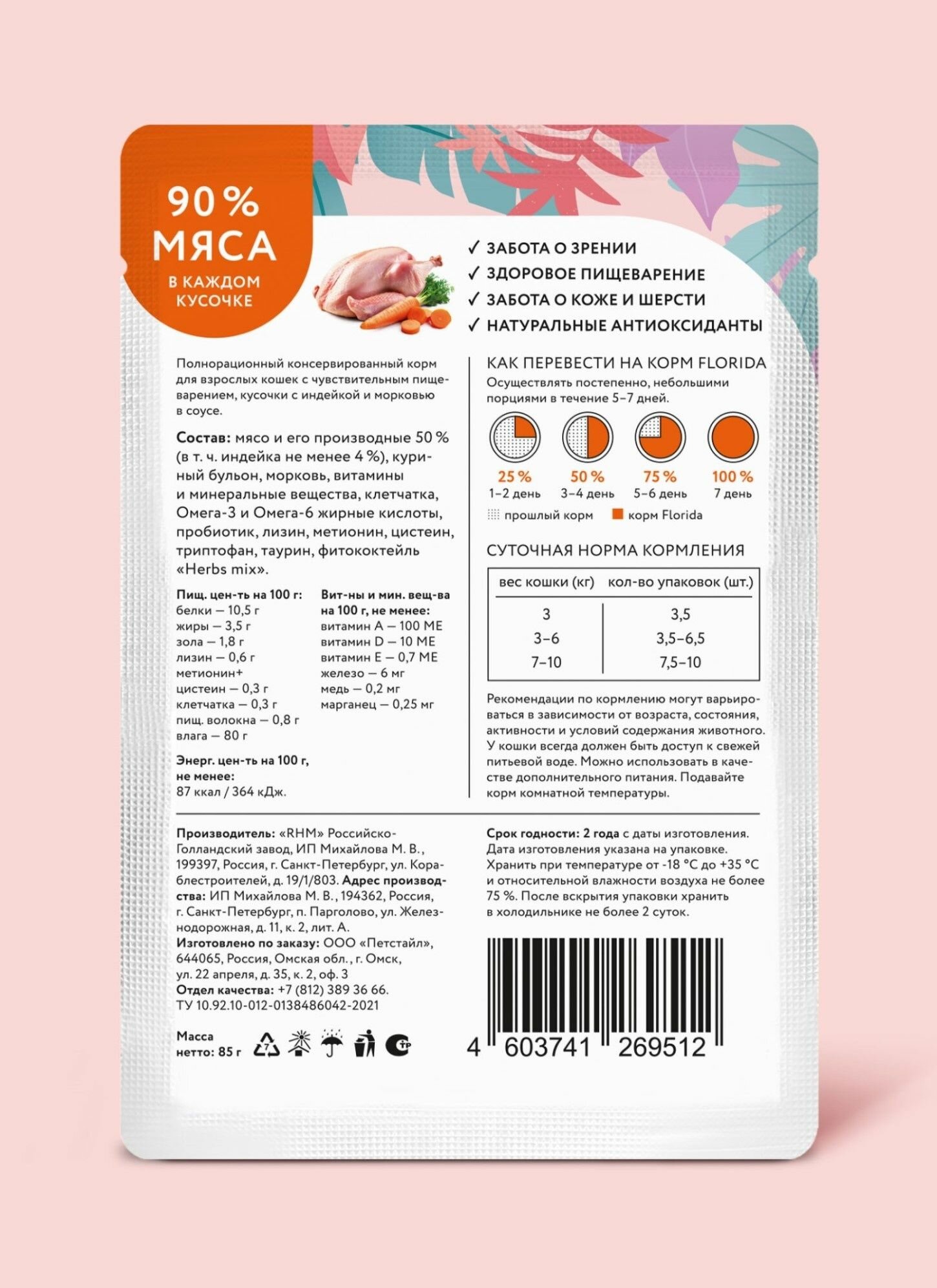 FLORIDA паучи для взрослых кошек с чувствительным пищеварением: кусочки с индейкой и морковью в соусе 0,085 кг. х 6 шт.