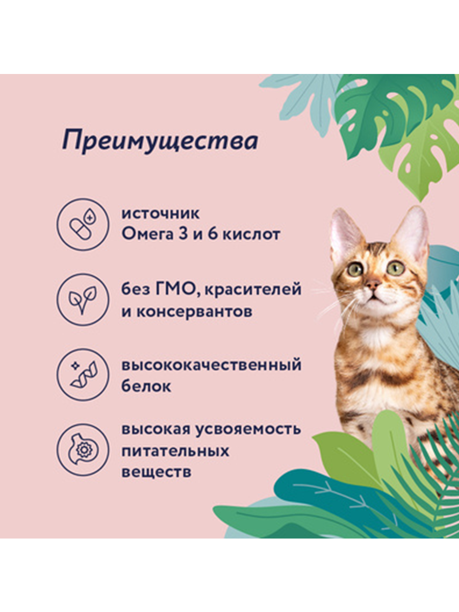 | Особые потребности | гипоаллергенный / для беременных / кормящих кошек / для вывода шерсти / для живущих в помещении / для живущих на улице / для здоровья кожи и блеска шерсти / для здоровья костей и суставов / для профилактики стресса / для снижения запаха стула / для стерилизованных/кастрированных / при чувствительном пищеварении / профилактика МКБ / профилактика зубного камня / профилактика избыточного веса |