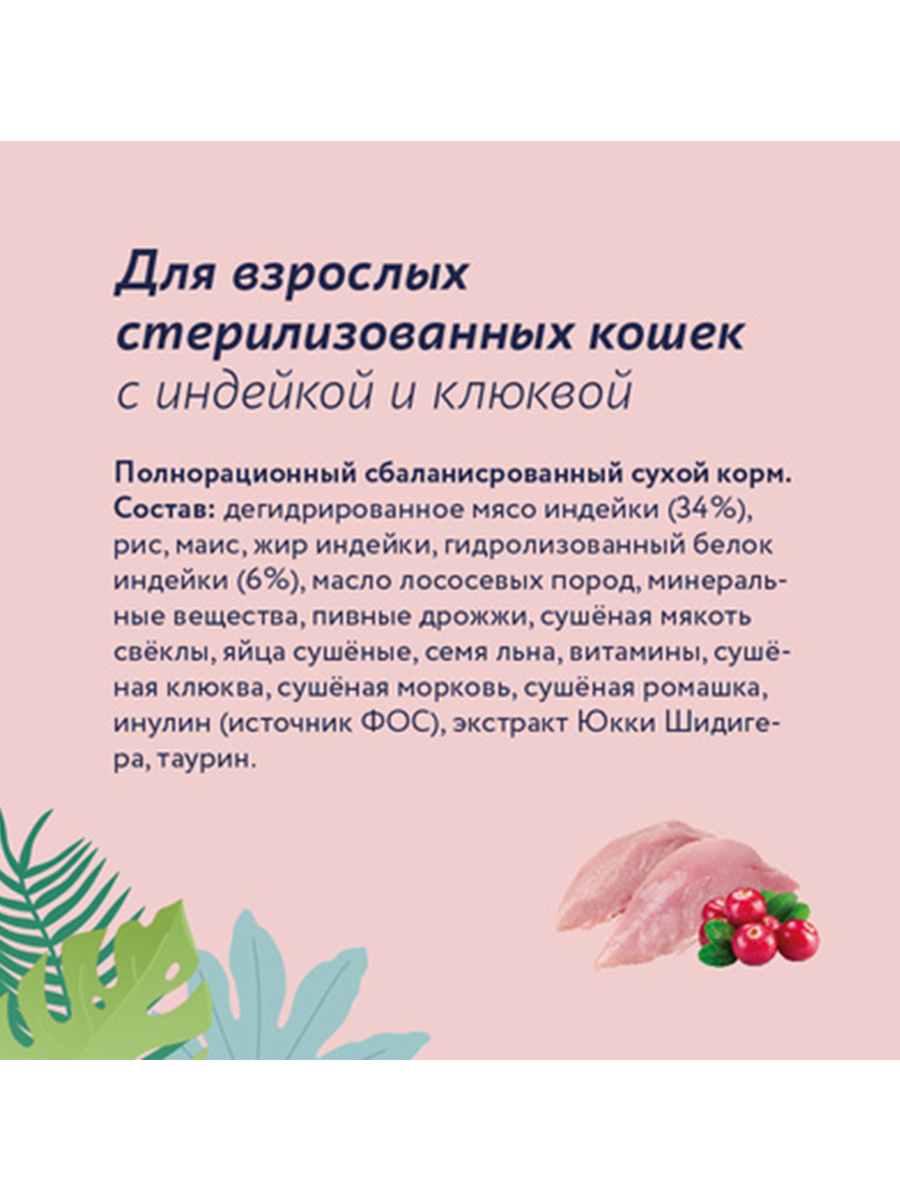 FLORIDA Сухой корм для взрослых стерилизованных кошек с индейкой и клюквой, 0,8кг