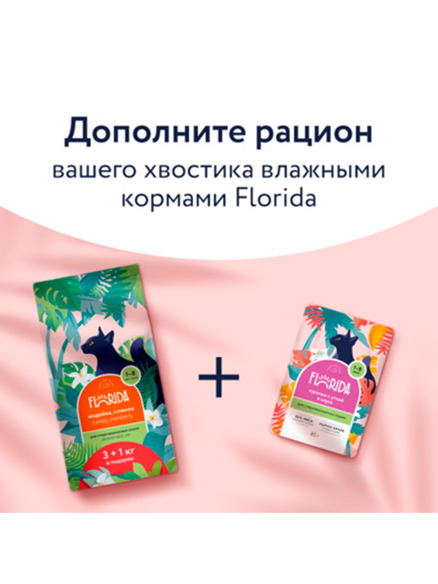 Florida сухой корм для взрослых стерилизованных кошек Индейка и клюква, 3 кг. + 1 кг.