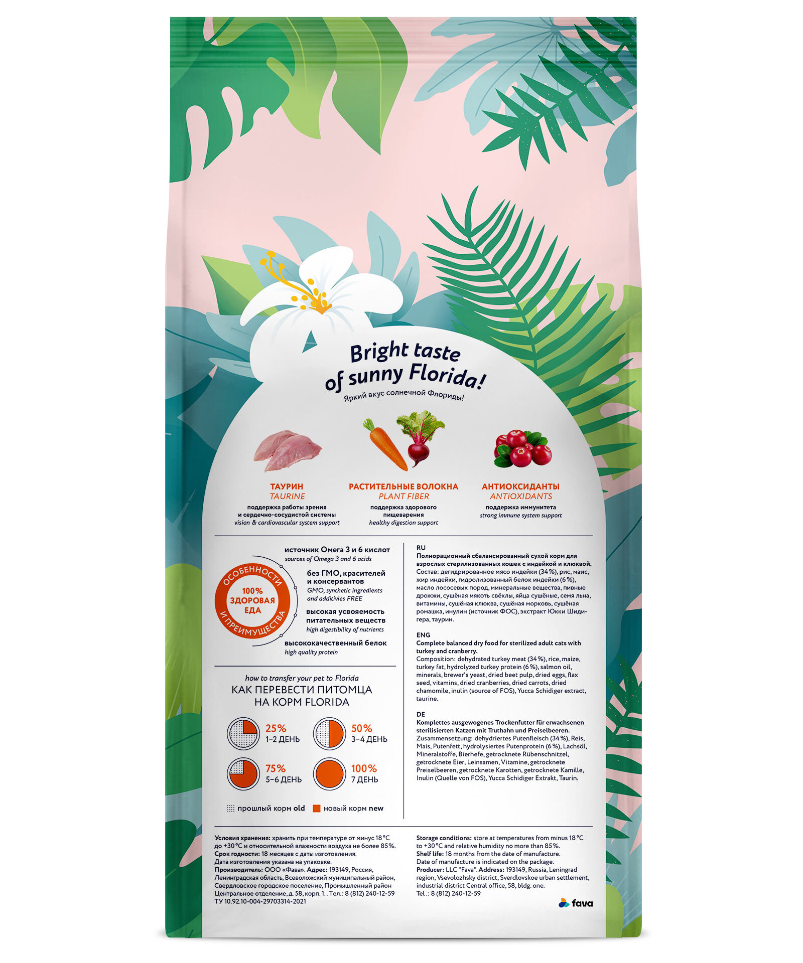 FLORIDA для взрослых кастрированных котов и стерилизованных кошек с индейкой и клюквой (3 + 1 кг)