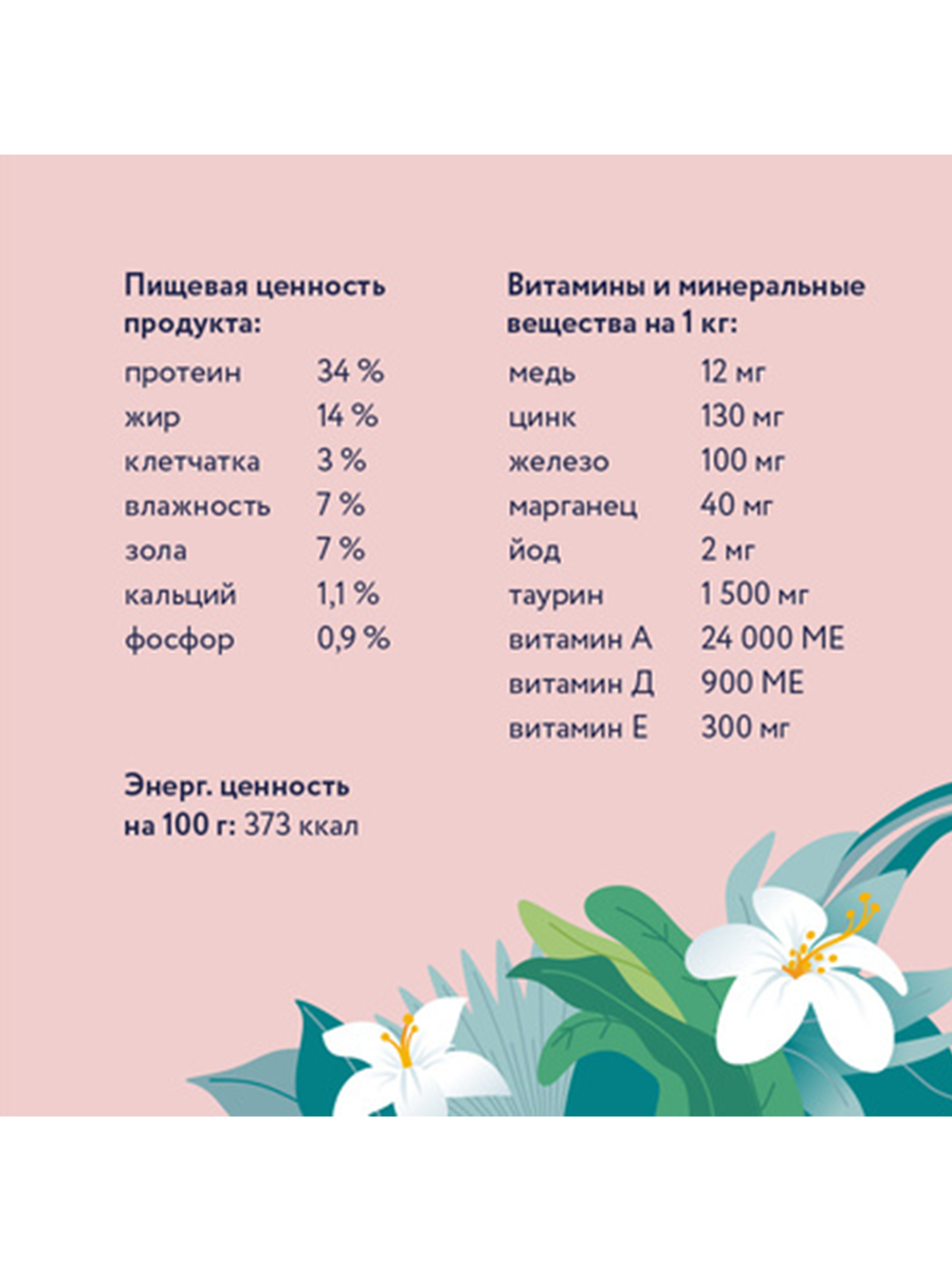 | Минеральные вещества | кальций 1,1%, фосфор 0,9%, медь 12 мг/кг, цинк 130 мг/кг, железо 100 мг/кг, марганец 40 мг/кг, йод 2 мг/кг, таурин 1500 мг/кг |