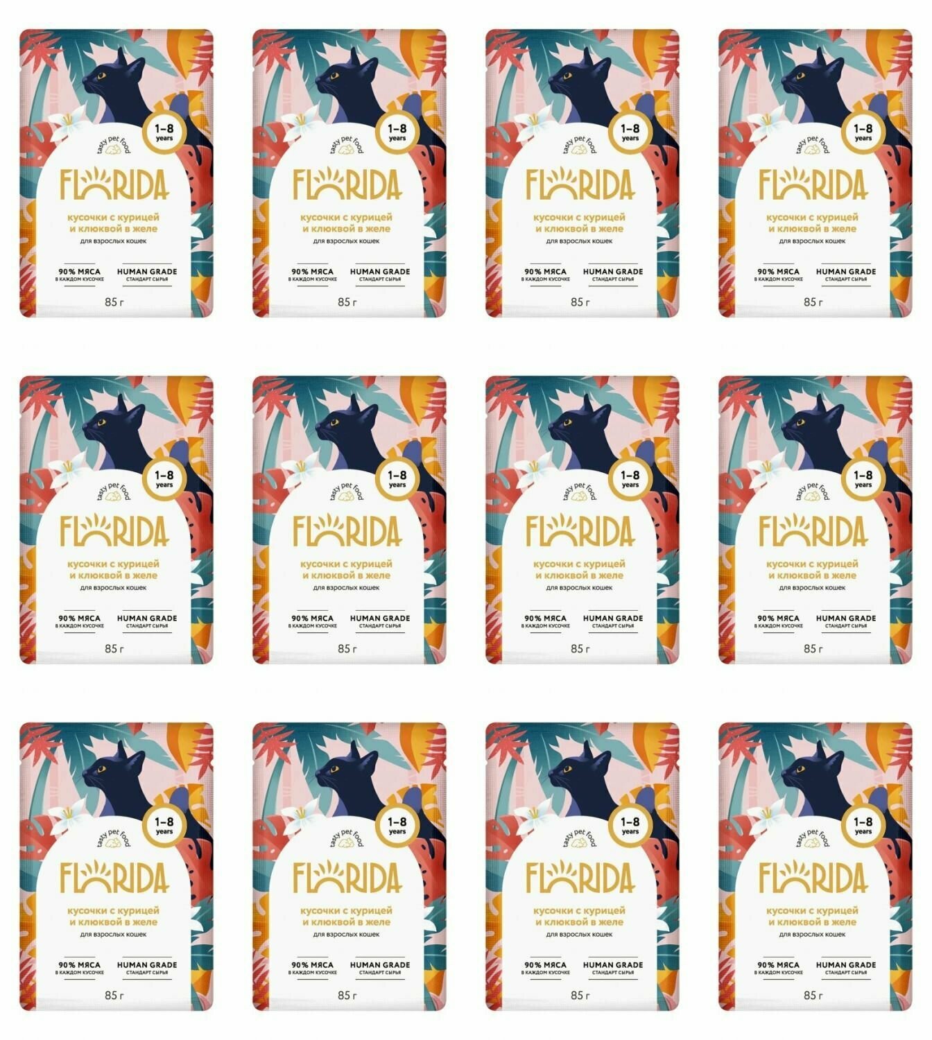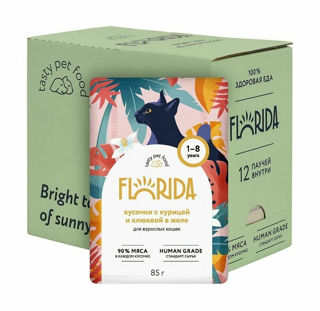 Влажный корм FLORIDA Паучи для взрослых кошек кусочки с курицей и клюквой в желе 85гр (12 банок)