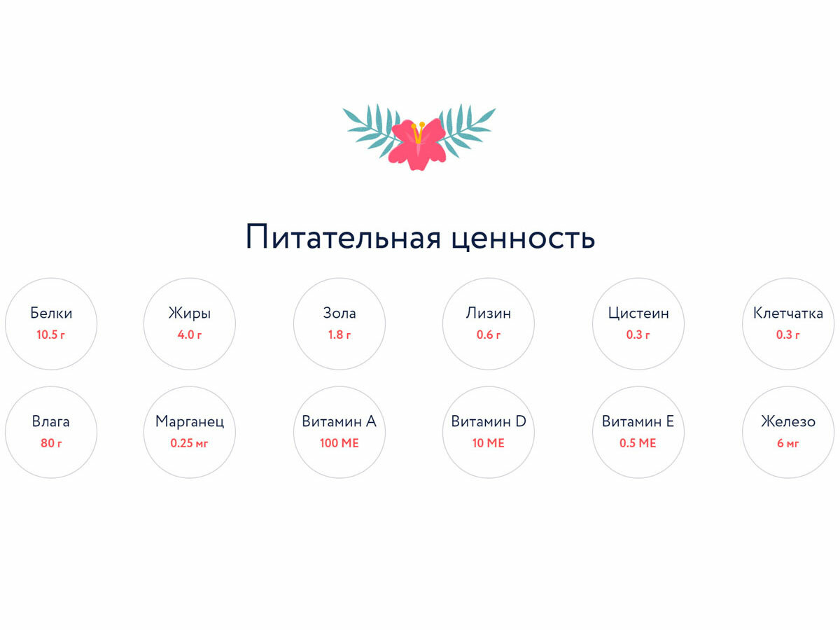 | Пищевая ценность | белки 34%, жир 16%, клетчатка 3%, зола 7%, влажность 7%, кальций 1,1%, фосфор 0,9% |
