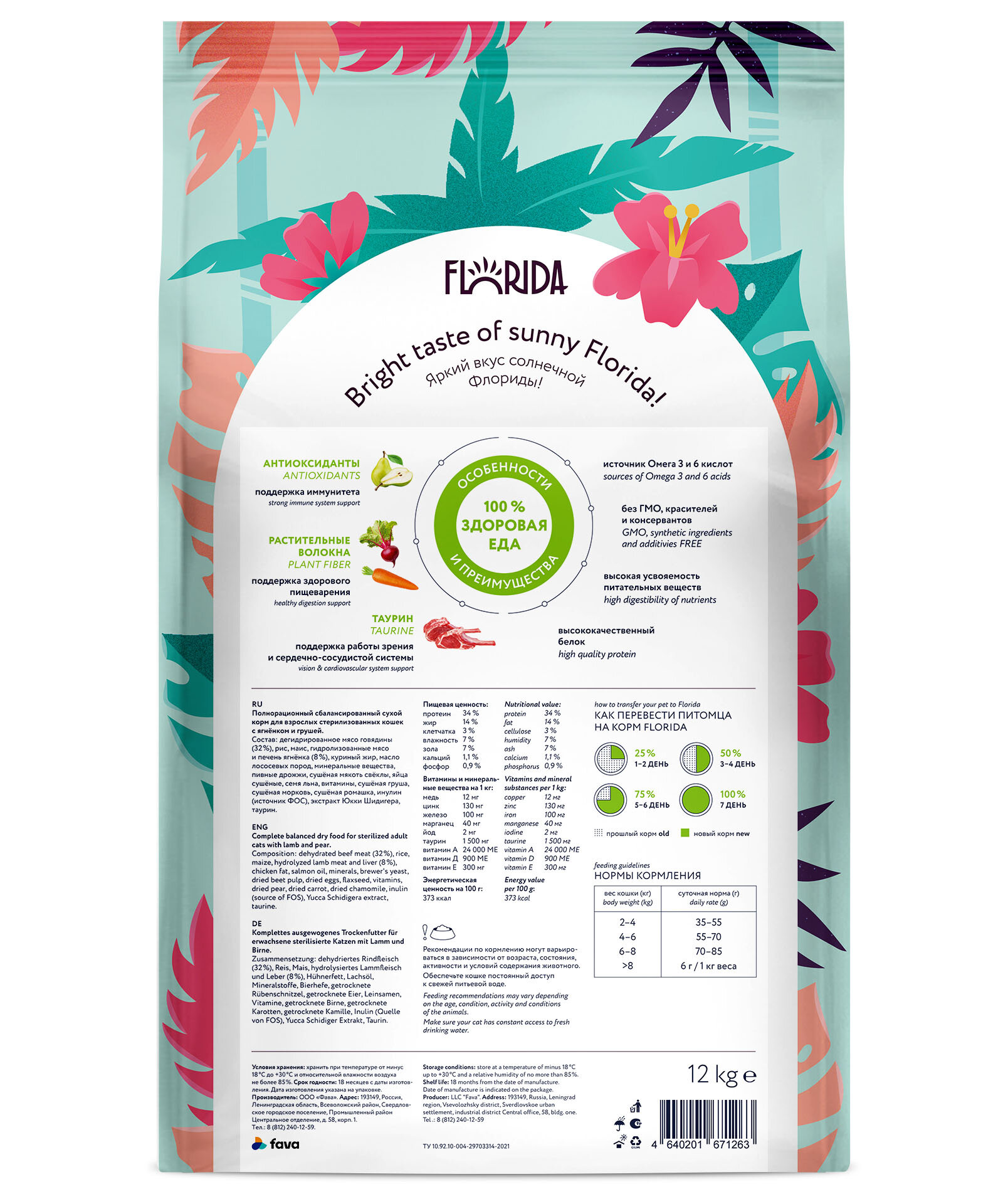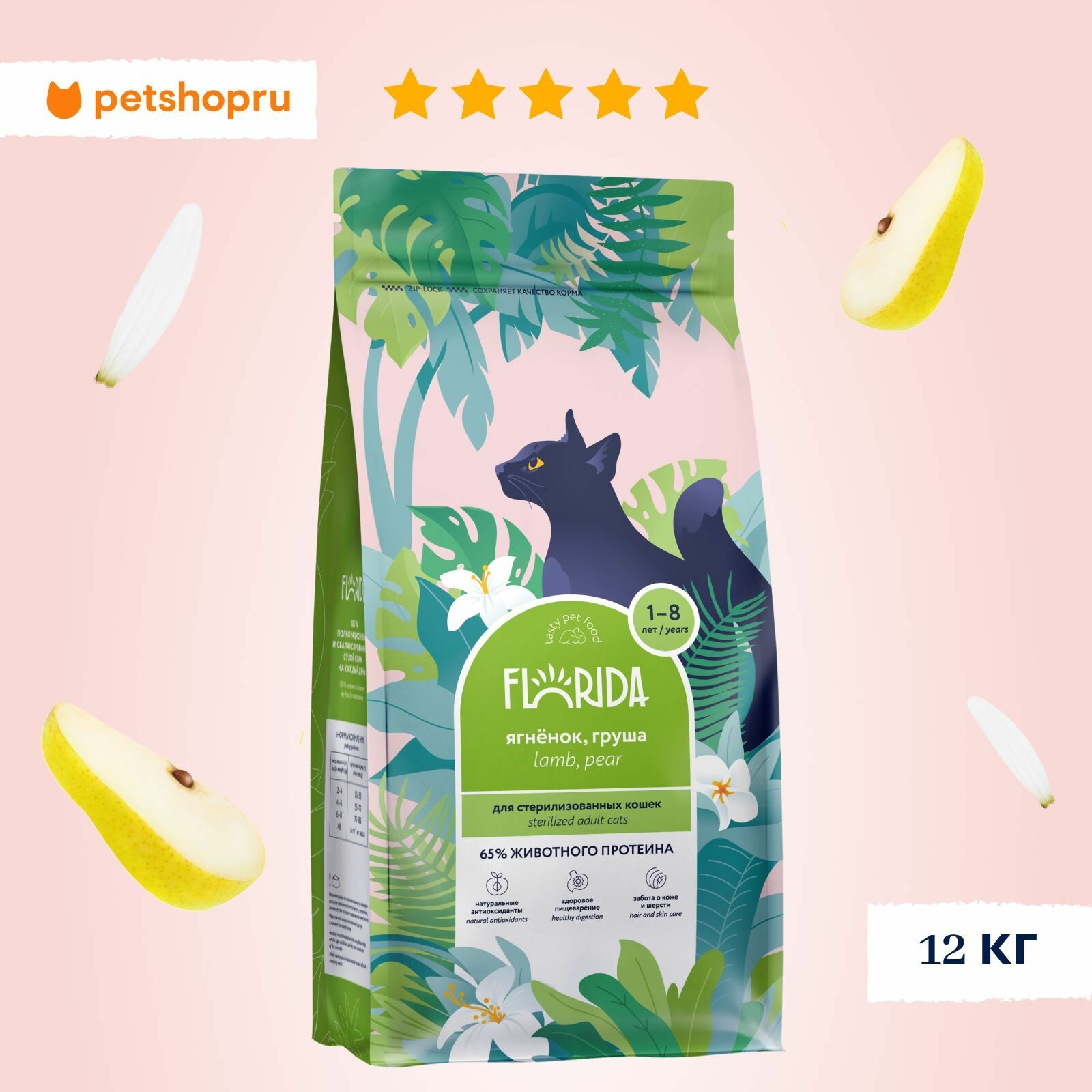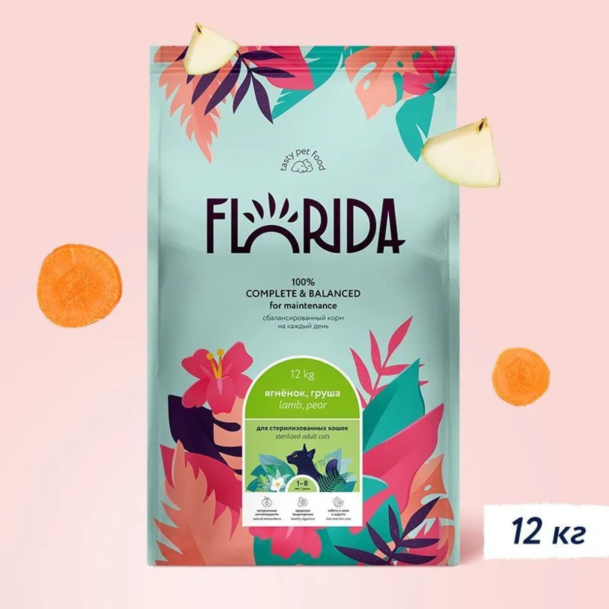 Сухой корм FLORIDA для взрослых кастрированных котов и стерилизованных кошек с ягненком и грушей (12 + 12 кг)