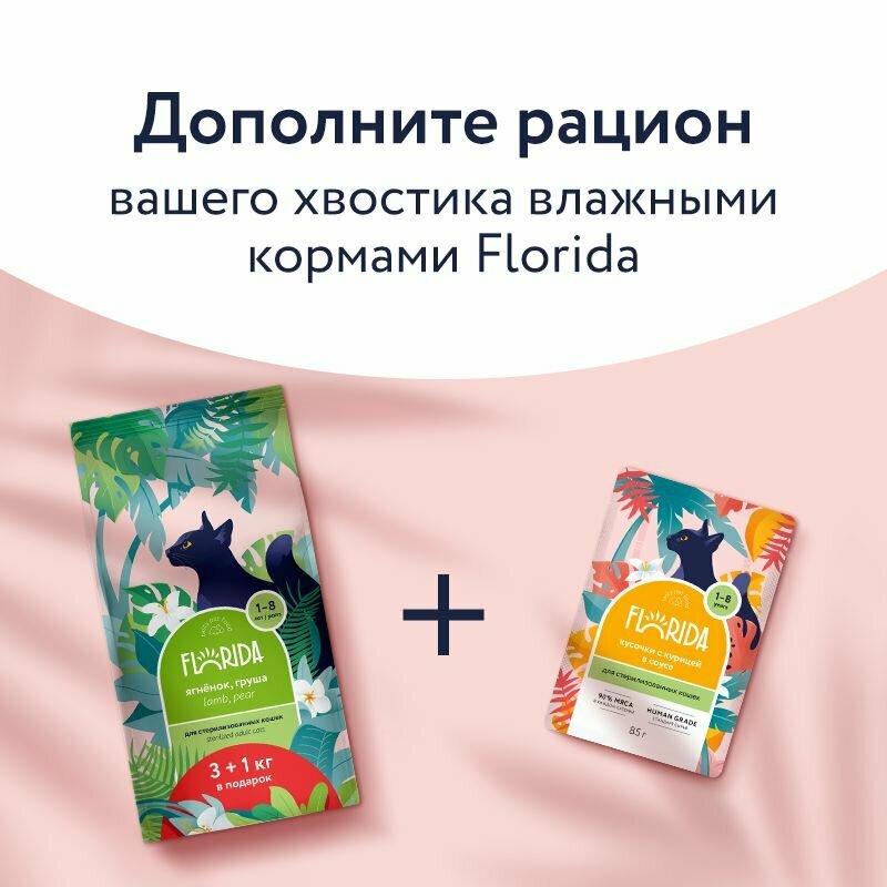 Сухой корм FLORIDA для взрослых стерилизованных кошек: ягненок с грушей 3+1кг
