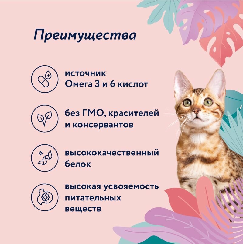 | Особые потребности | гипоаллергенный / для беременных / кормящих кошек / для вывода шерсти / для живущих в помещении / для живущих на улице / для здоровья кожи и блеска шерсти / для здоровья костей и суставов / для профилактики стресса / для снижения запаха стула / для стерилизованных/кастрированных / при чувствительном пищеварении / профилактика МКБ / профилактика зубного камня / профилактика избыточного веса |