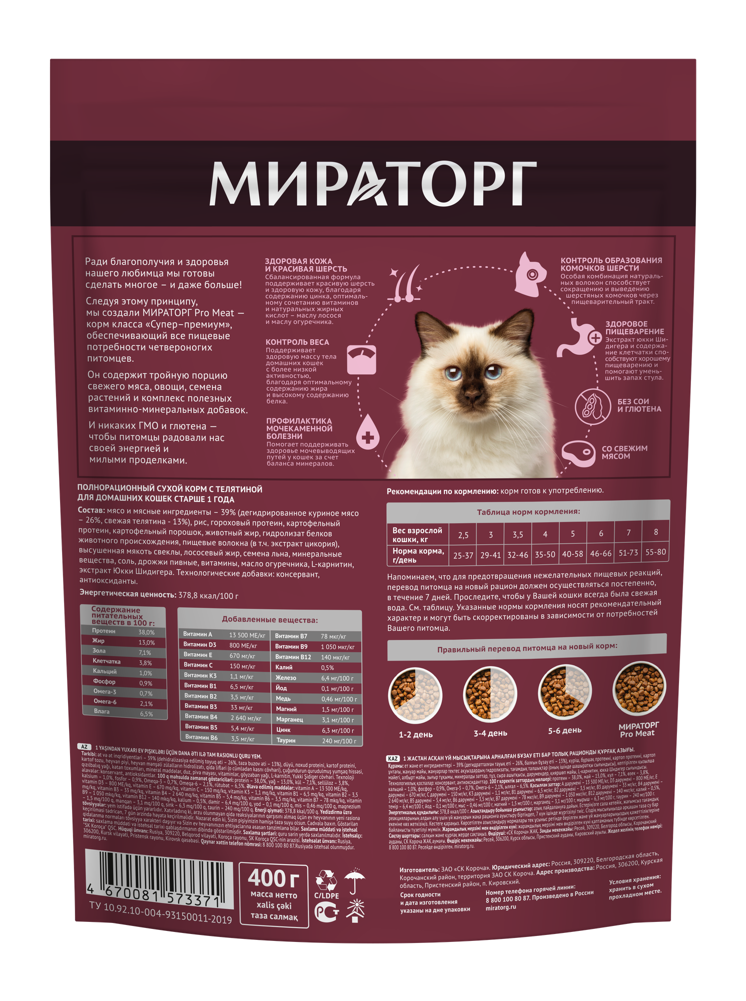 | Пищевая ценность | влага — макс.10,0% протеин — мин. 32,0% жир — мин. 10,0% зола — макс. 9,2% клетчатка — макс. 2,0% кальций — мин. 1,0% фосфор — мин. 0,9% |