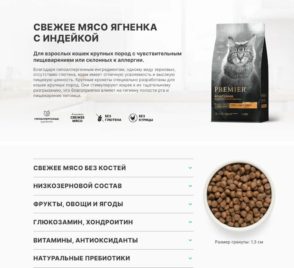 СохранитьСухой корм Premier свежее мясо ягненка С индейкой для взрослых кошек крупных пород с чувствительным пищеварением или склонных к аллергии, 2 кг интересное: